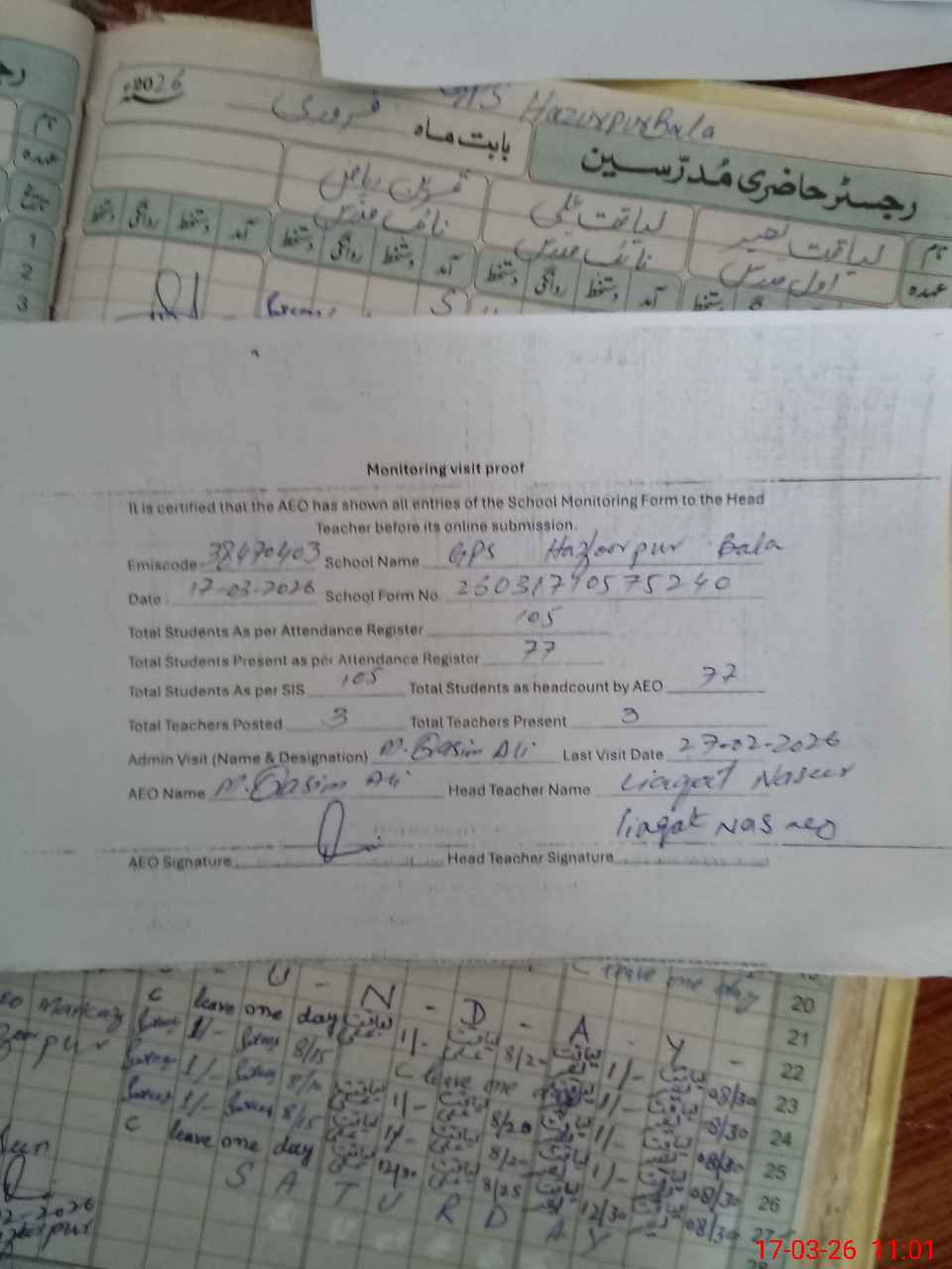 | Attendance Register | Head Teacher | MEA with School | Visit Proof |