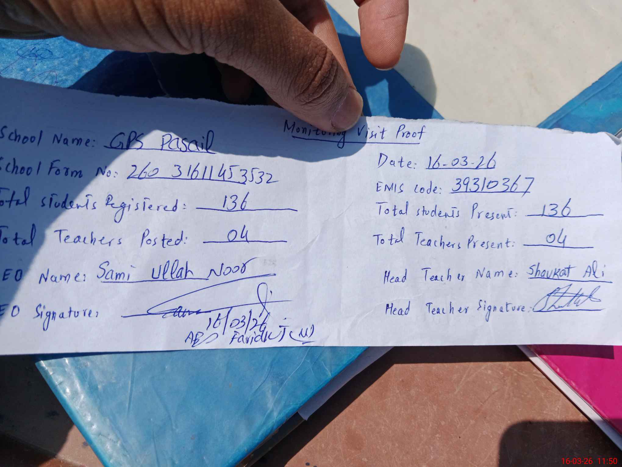 | Attendance Register | Head Teacher | MEA with School | Visit Proof |