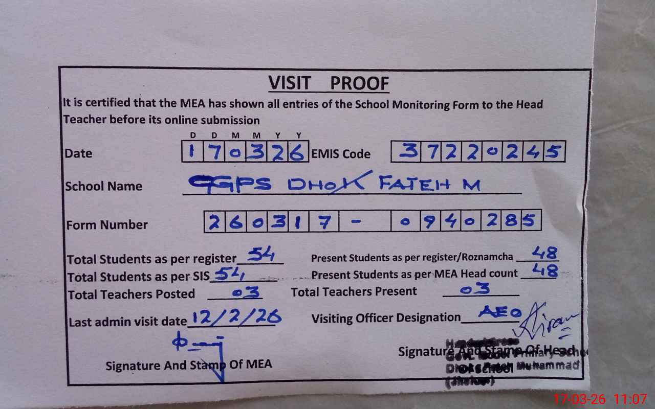 | EMIS Code: 37220245 | Name of School: GGPS DHOK FATEH MUHAMMAD | |||