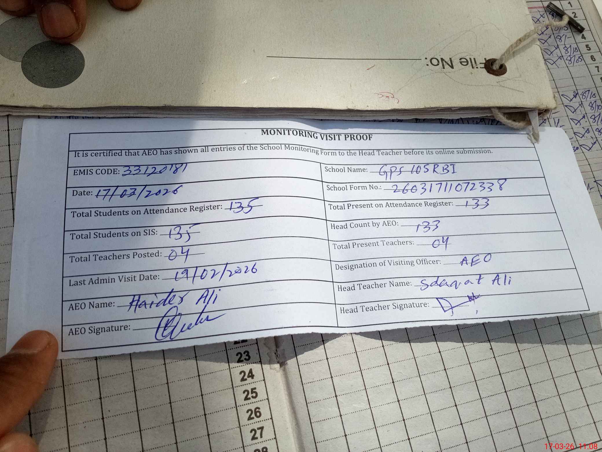 | Attendance Register | Head Teacher | MEA with School | Visit Proof |