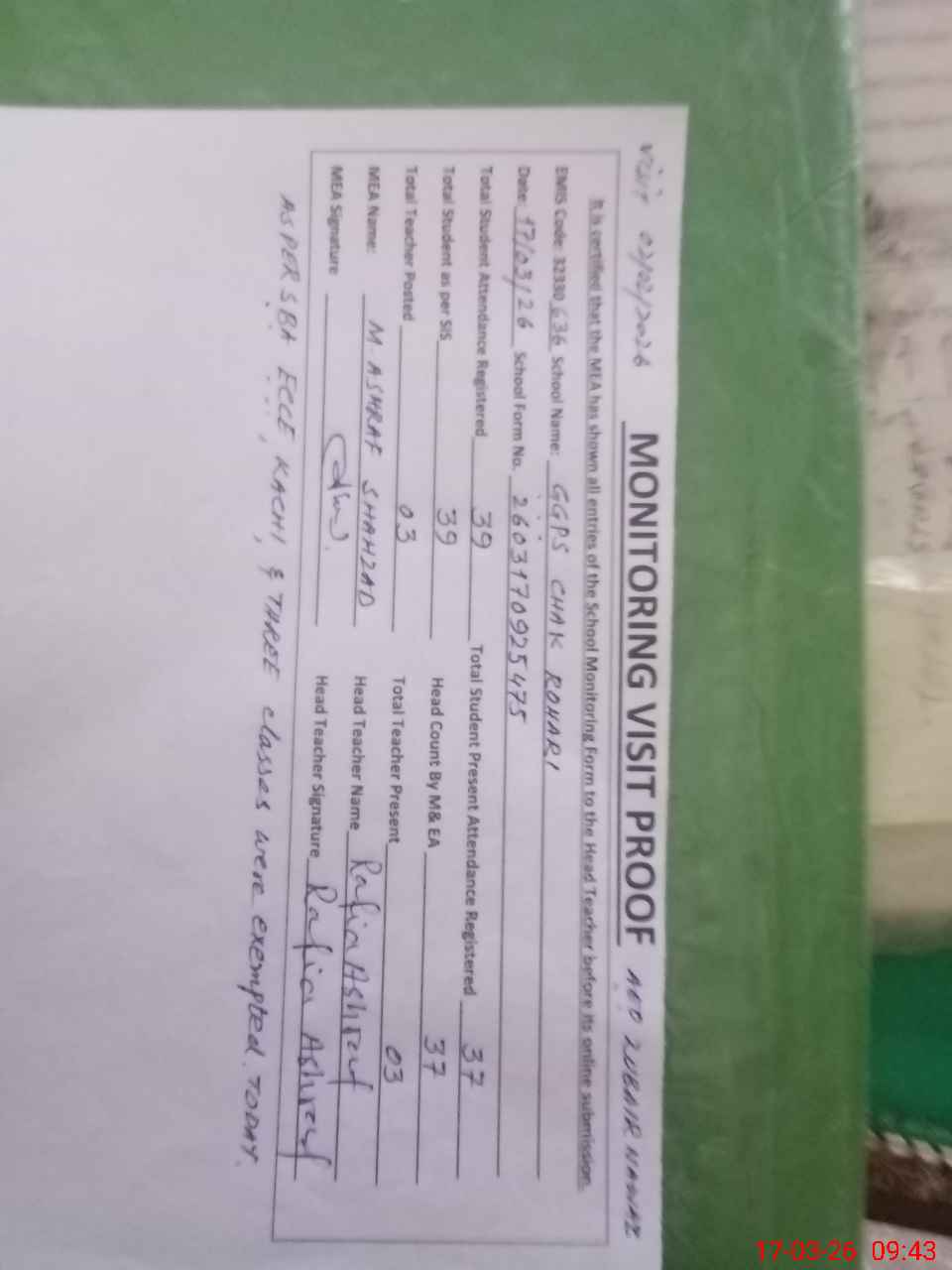 | Remarks (Use Separate Page if Required): As per SBA ECCE, KACHI, and Three Classes were exempted from Exam NSB Record still missing from 2024-25 Aeo log book last month only one written and one missing | |||||