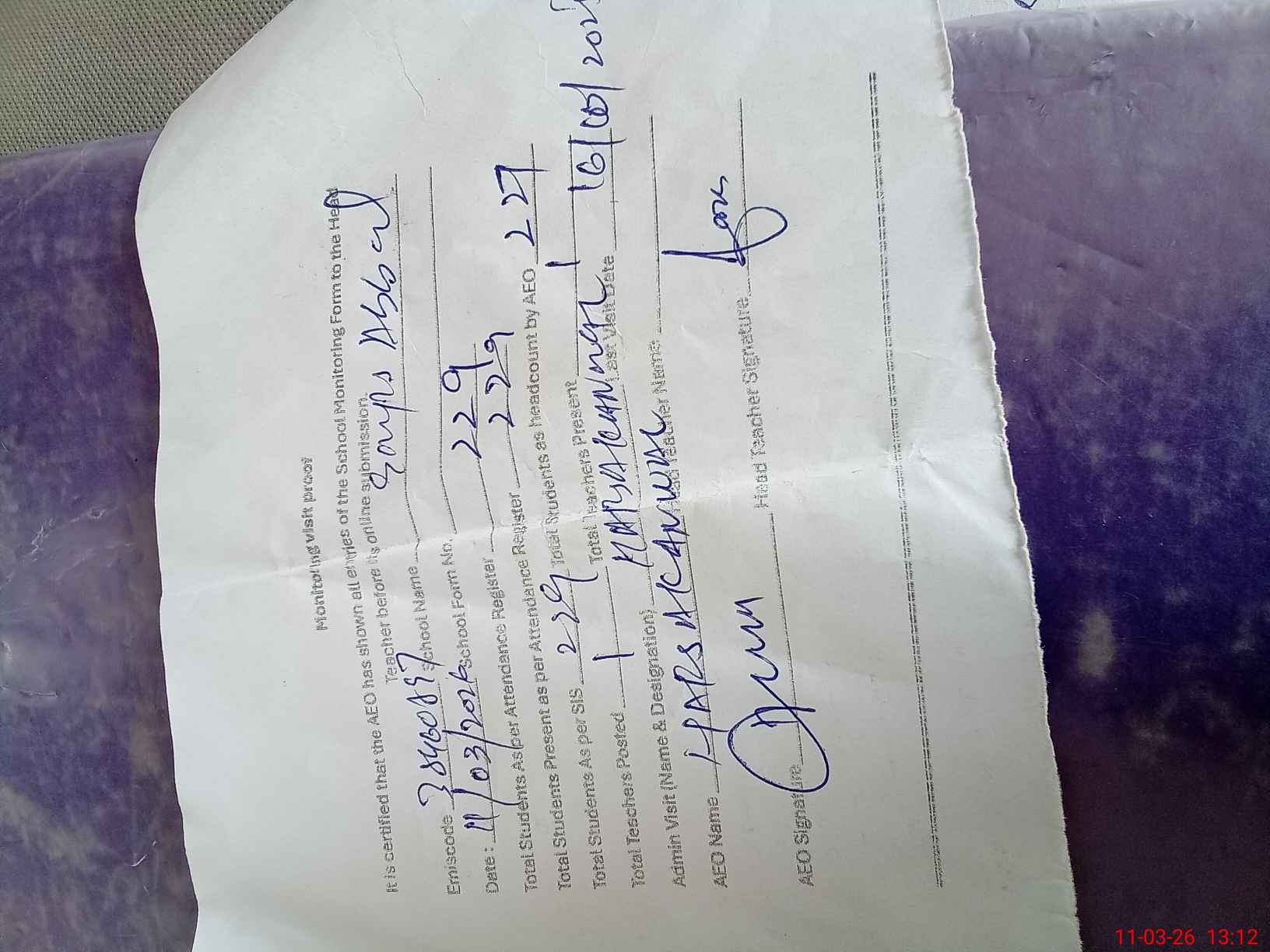 | Attendance Register | Head Teacher | MEA with School | Visit Proof |