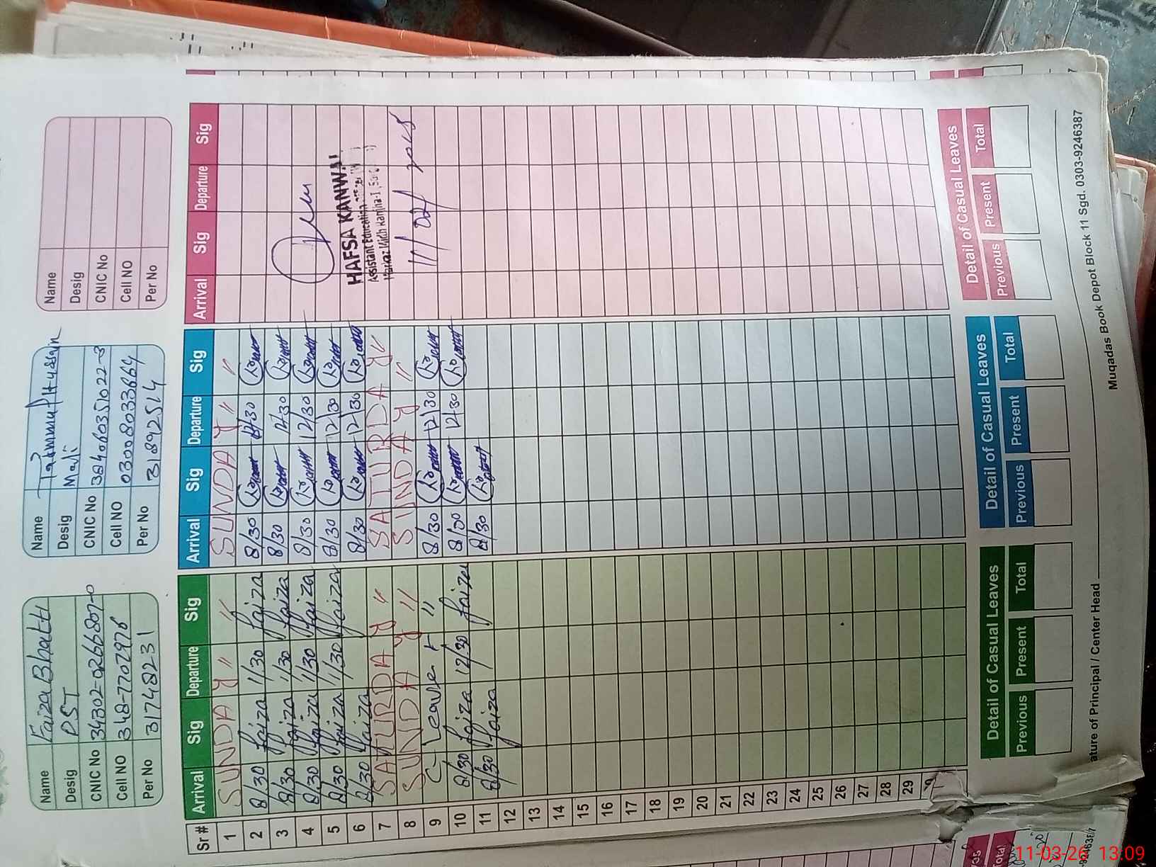 | CNIC | Full Name | Designation | R/C | Absence during last cal. month |