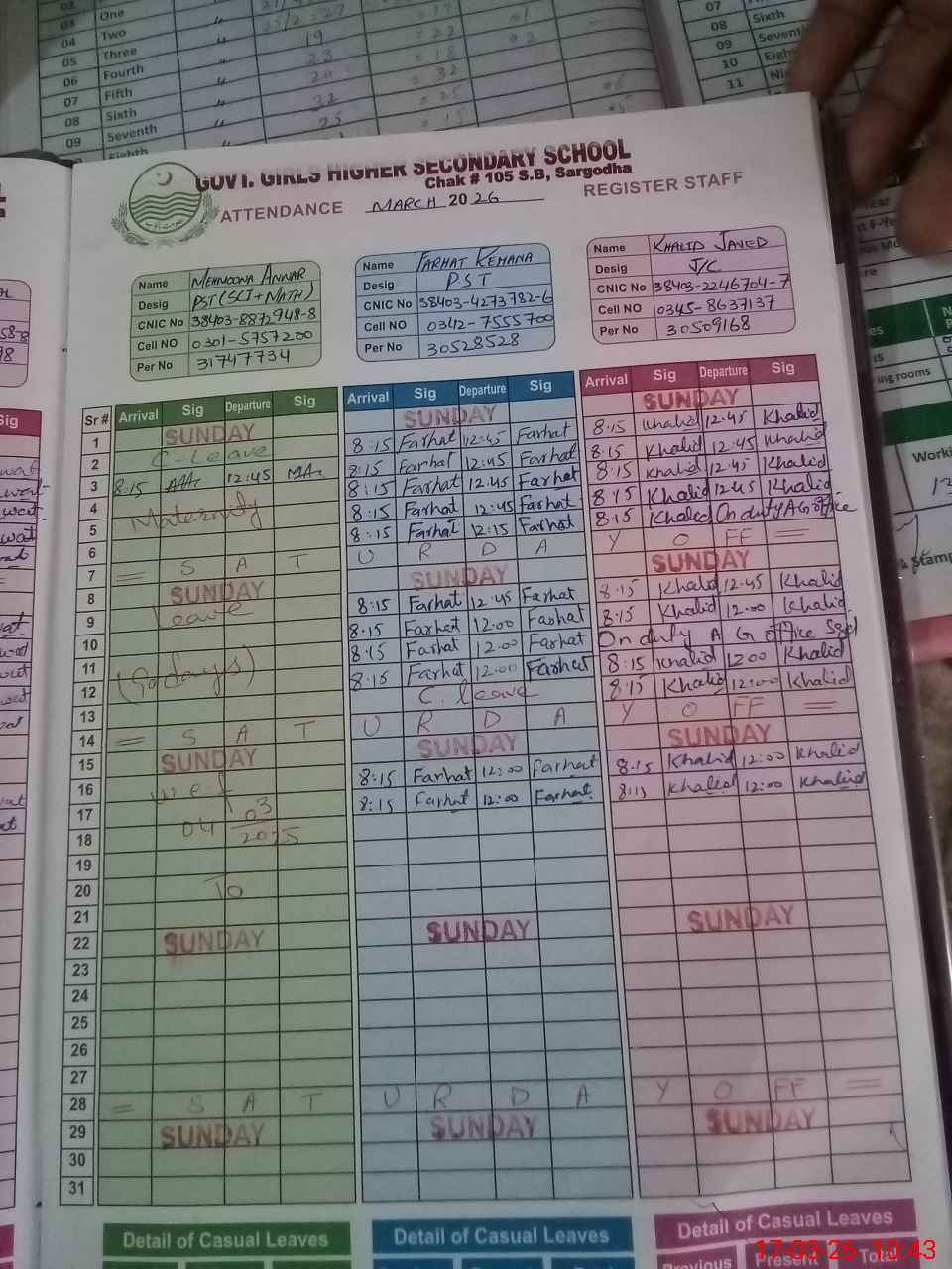 | CNIC | Full Name | Designation | R/C | Absence During Last Calender Month |