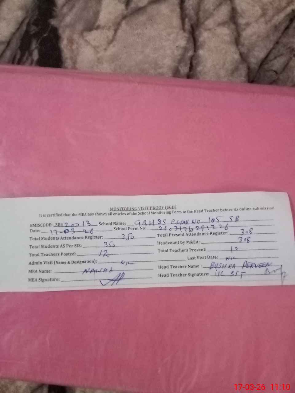 | Attendance Register | Head Teacher | MEA with School | Visit Proof |
