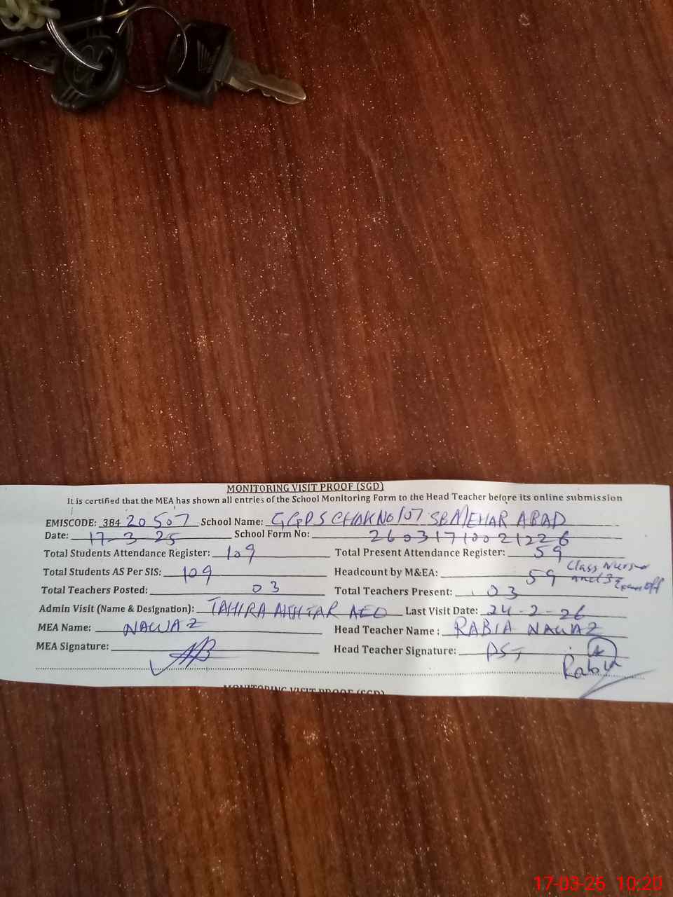 | EMIS Code: 38420507 | Name of School: GGPS CHAK NO.107 SB MEHAR ABAD | |||