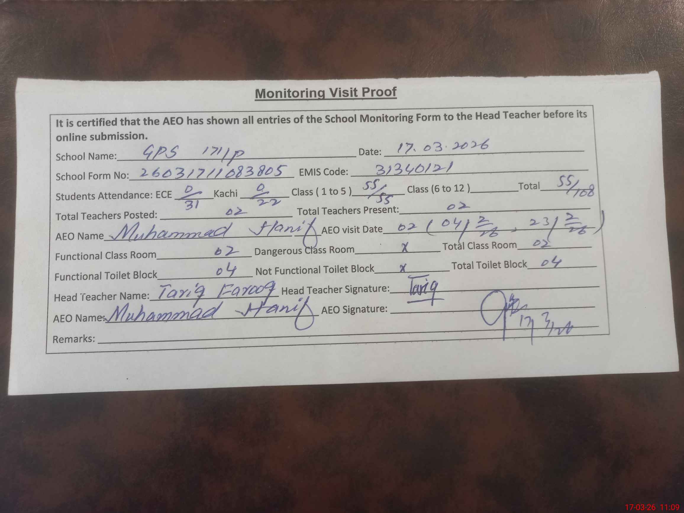 | Attendance Register | Head Teacher | MEA with School | Visit Proof |
