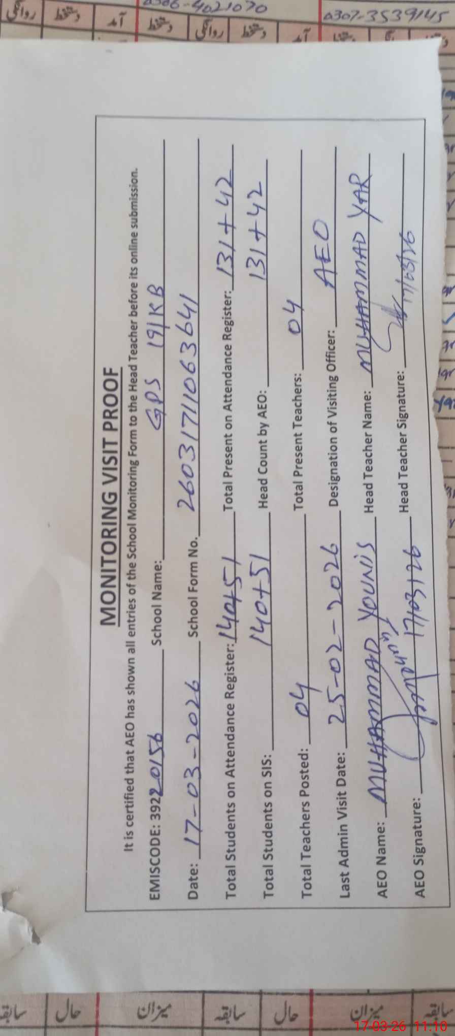 | Attendance Register | Head Teacher | MEA with School | Visit Proof |