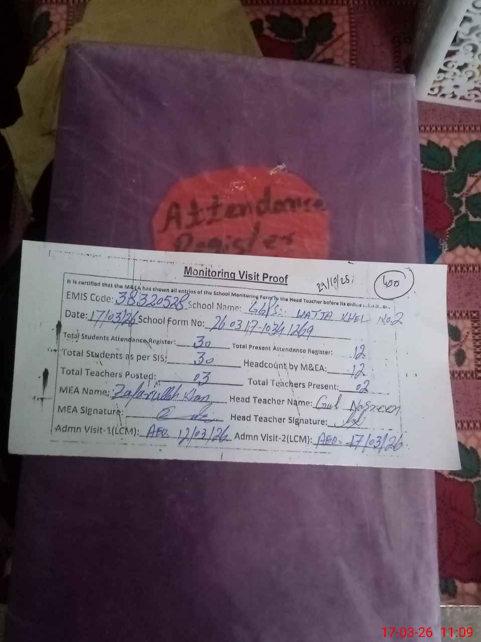 | Attendance Register | Head Teacher | MEA with School | Visit Proof |