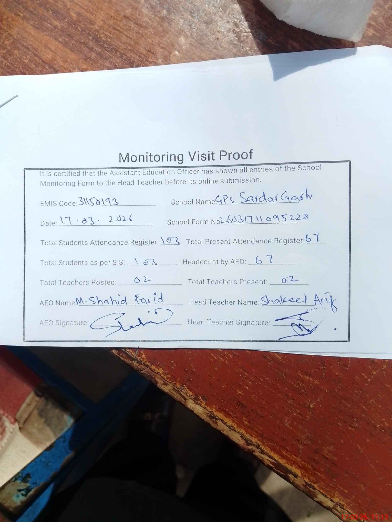 | EMIS Code: 31150193 | Name of School: GPS SARDAR GARH | |||