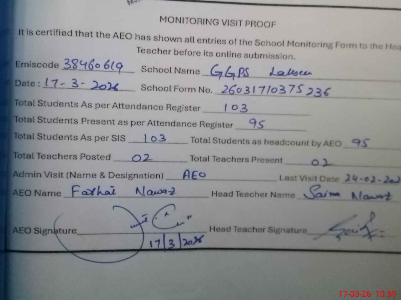 | Attendance Register | Head Teacher | MEA with School | Visit Proof |