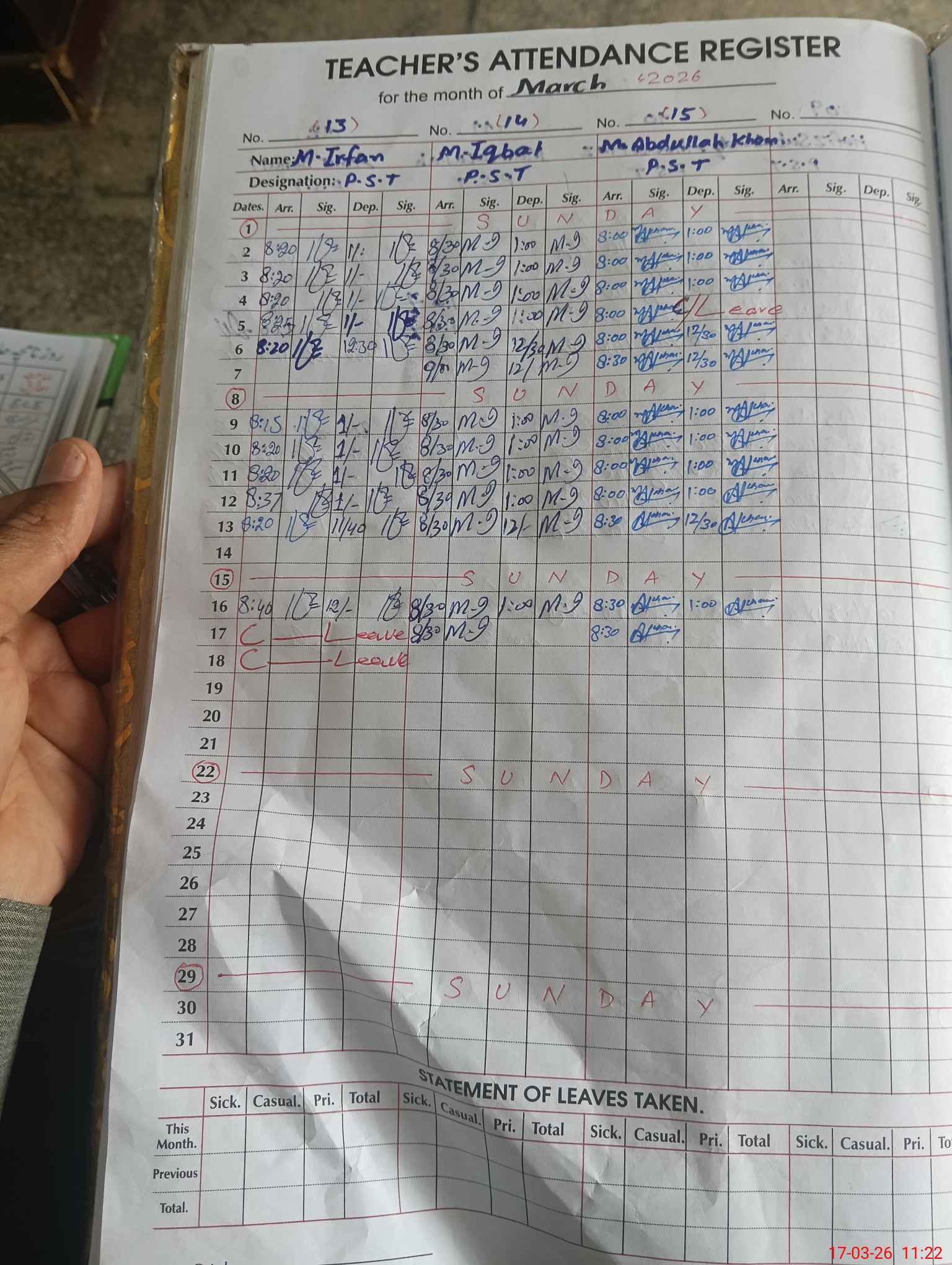 | CNIC | Full Name | Designation | R/C | Absence During Last Calender Month |