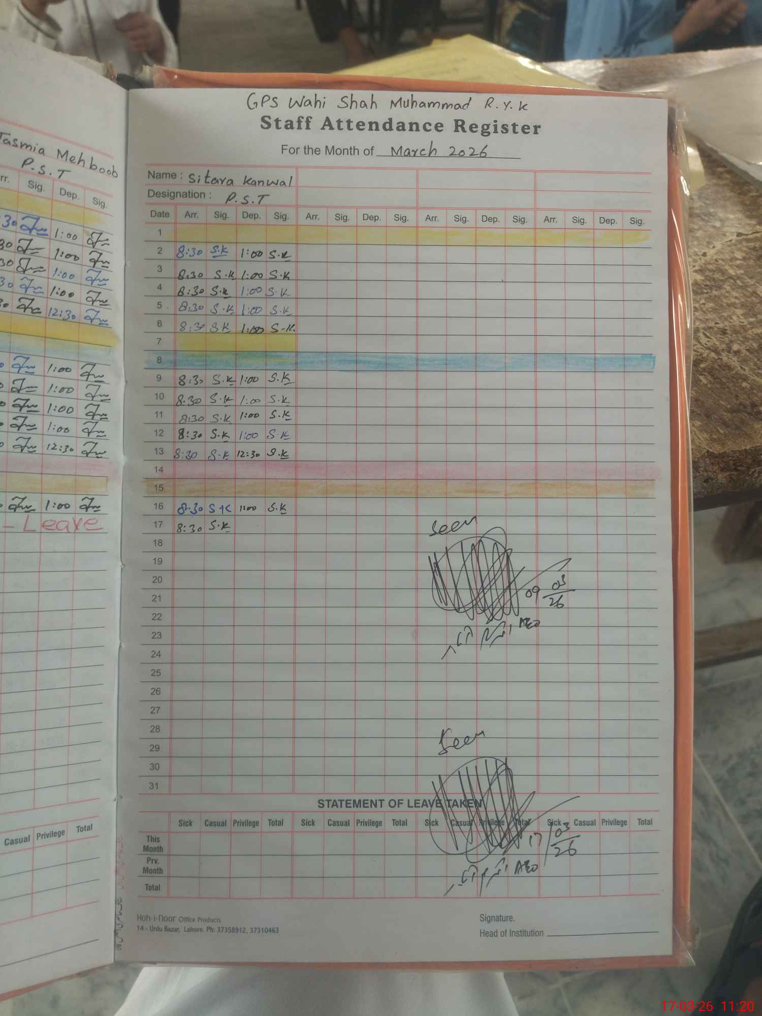 | Attendance Register | Head Teacher | MEA with School | Visit Proof |