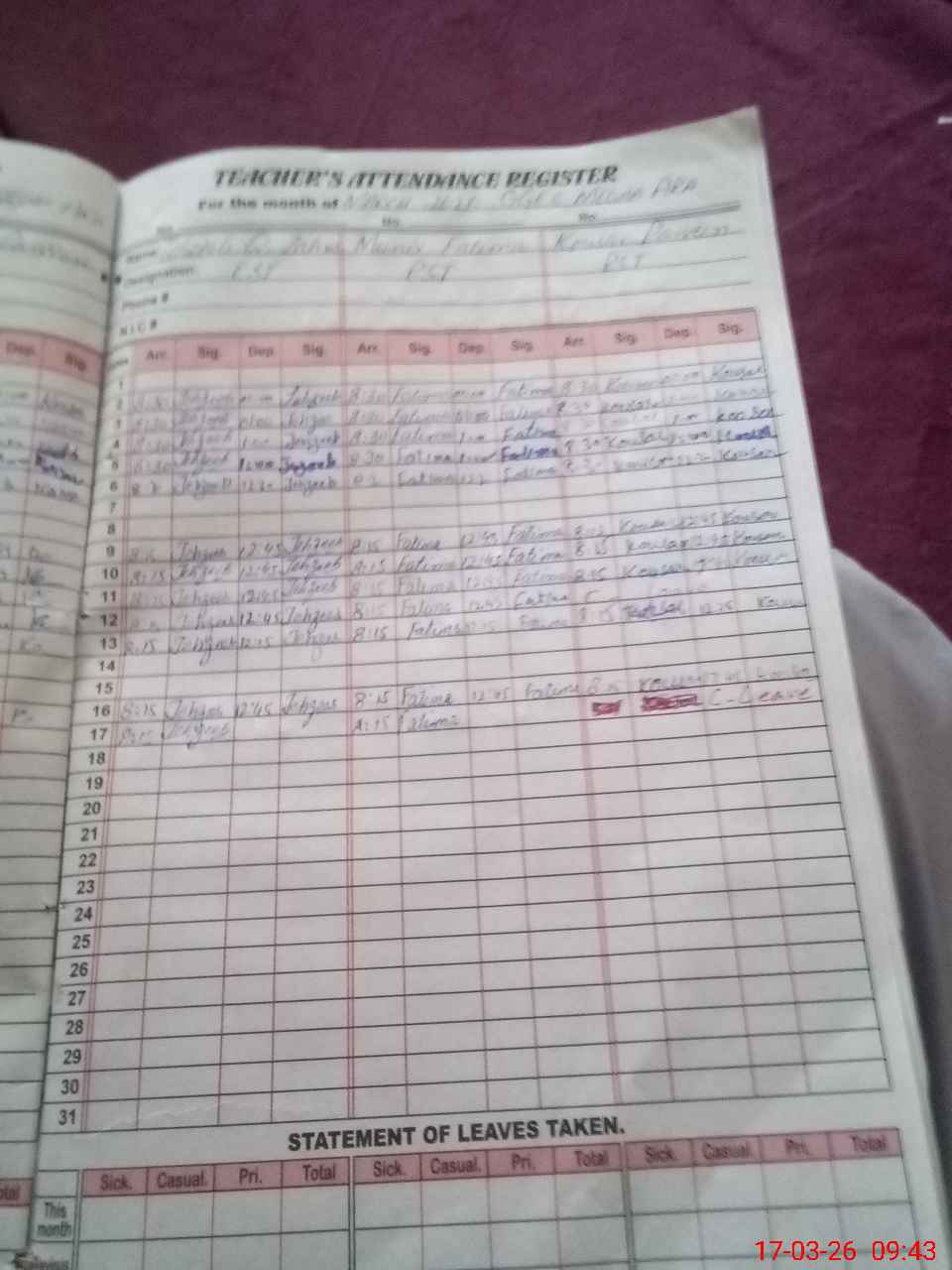 | 38**** | Ko**** Pa**** | PST Arts | Regular | 2 | 0 | 0 | 0 | 0 | 0 | 0 | 0 | 2 | Casual |