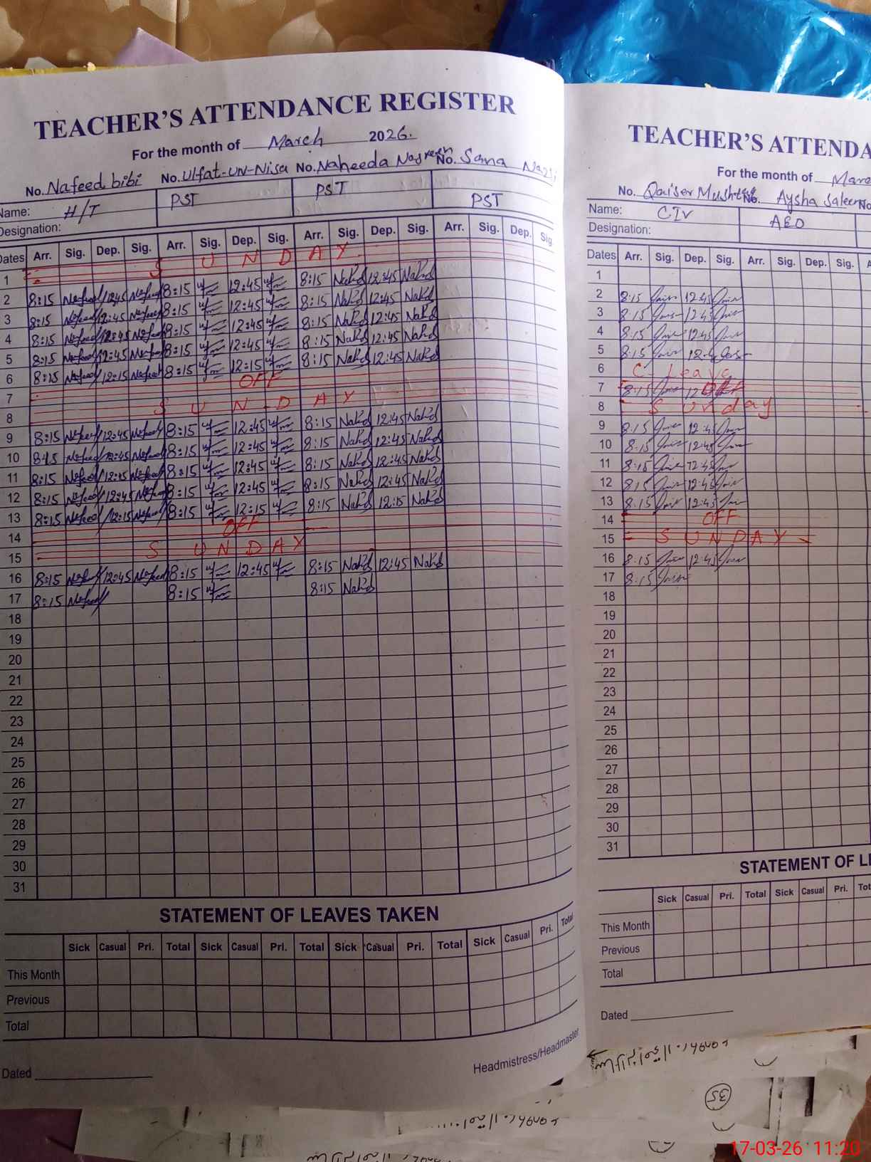 | Leave | Duty | Absent | Maternity | Medical | Ex- Pak |
