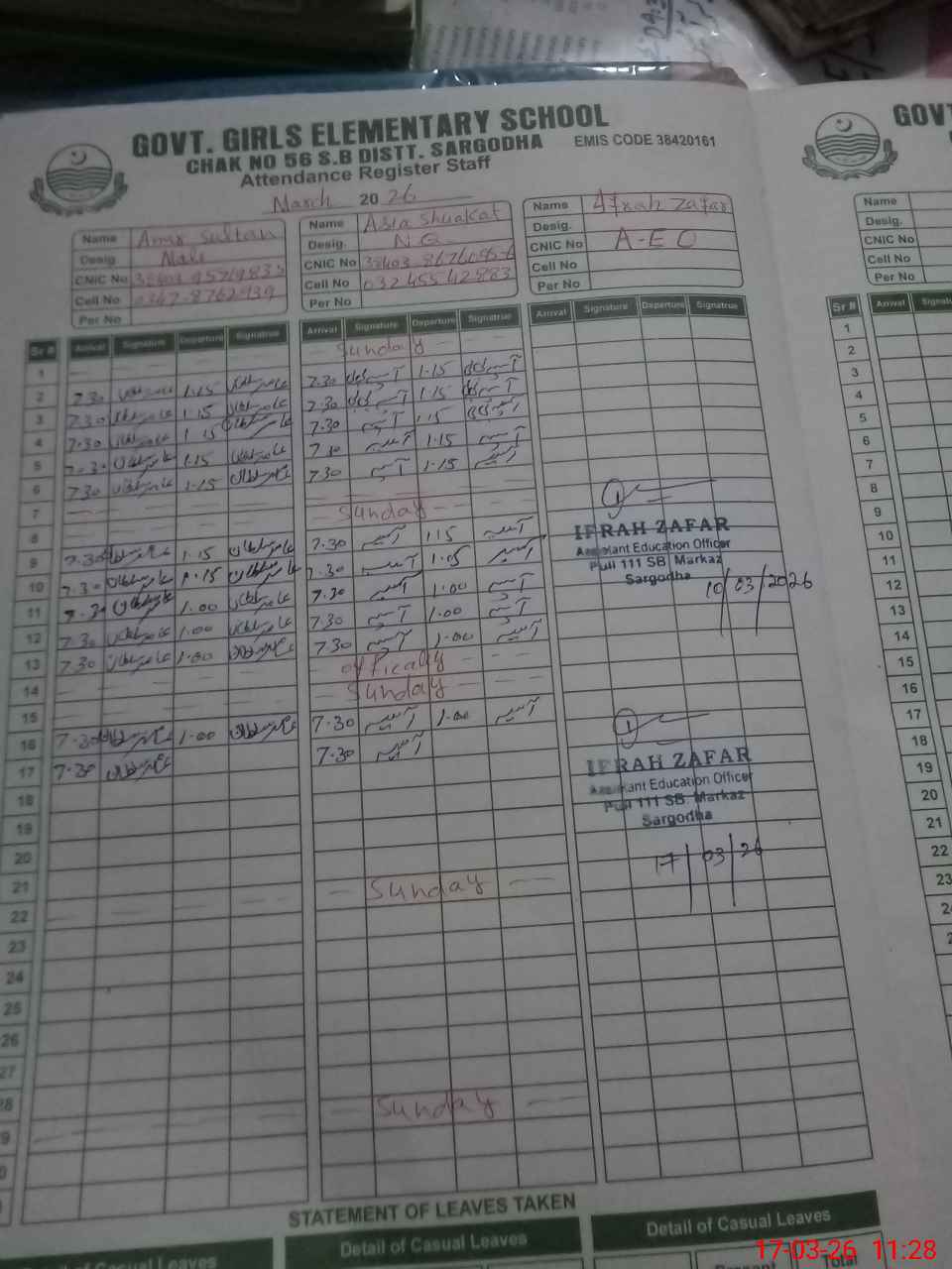 | CNIC | Full Name | Designation | R/C | Absence During Last Calender Month |