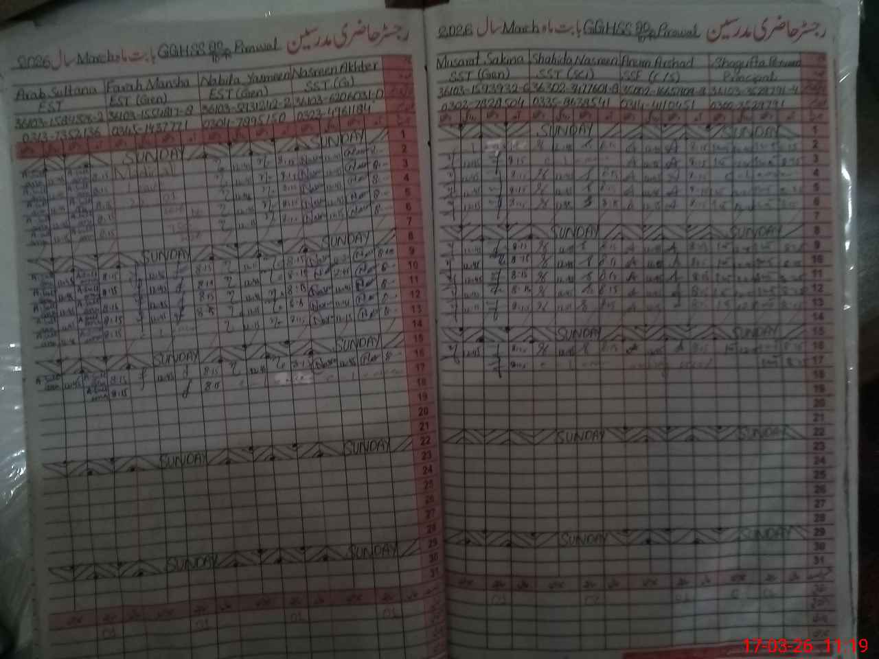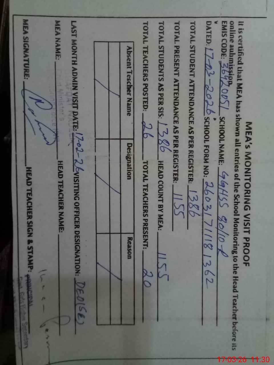| Remarks (Use Separate Page if Required): 1. classes ECE, Nursery,1,3, exam off attendence taken from roznamcha 2. classes 9,10,11,12 spare for board exam attendence taken from roznamcha 3. Second year online attendence taken from previous 4 . approximately 2000 feet boundary Wall missing 5. 03 toilets nonfunctional saverag line not complete d | |||||