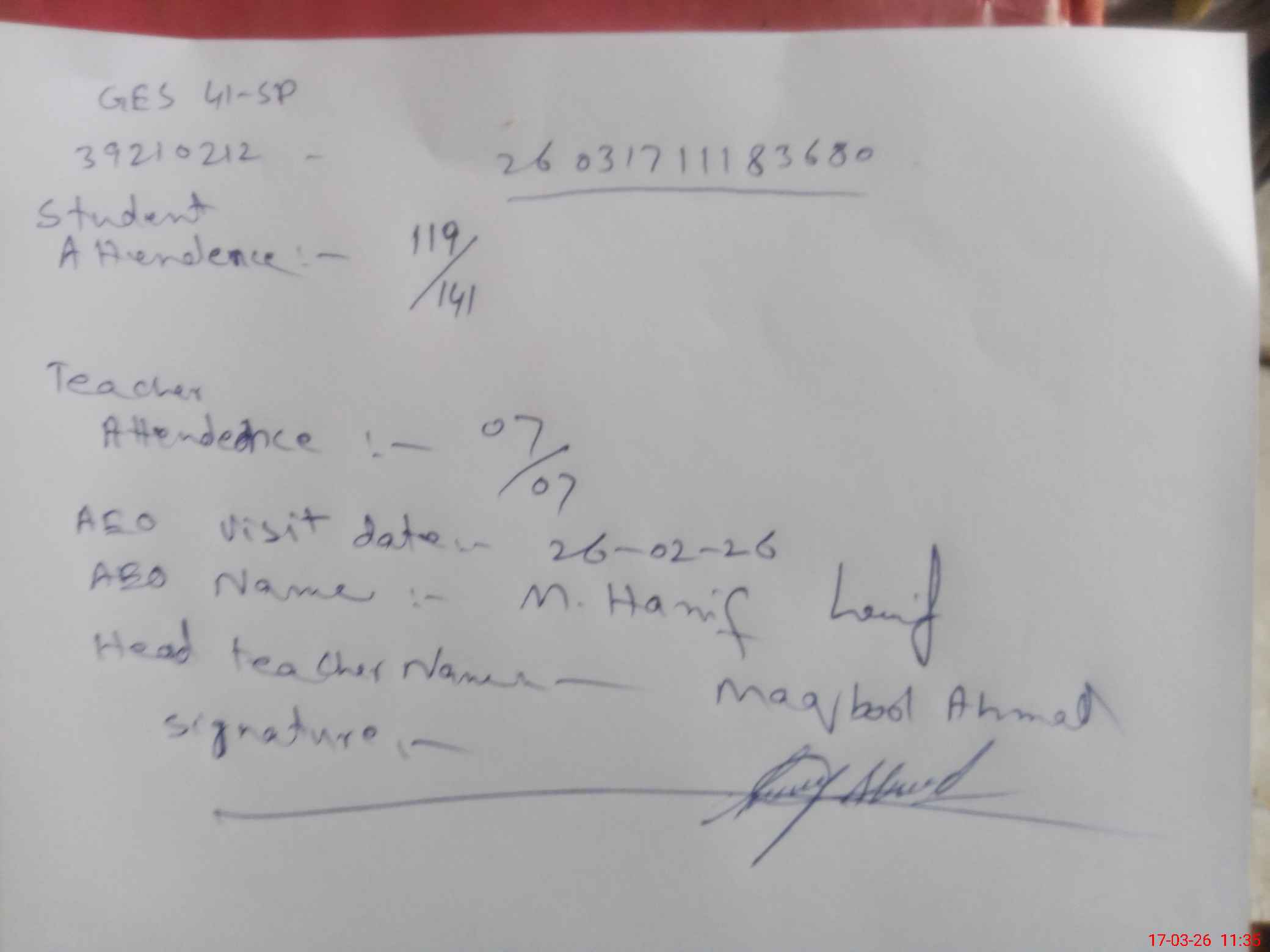| Attendance Register | Head Teacher | MEA with School | Visit Proof |