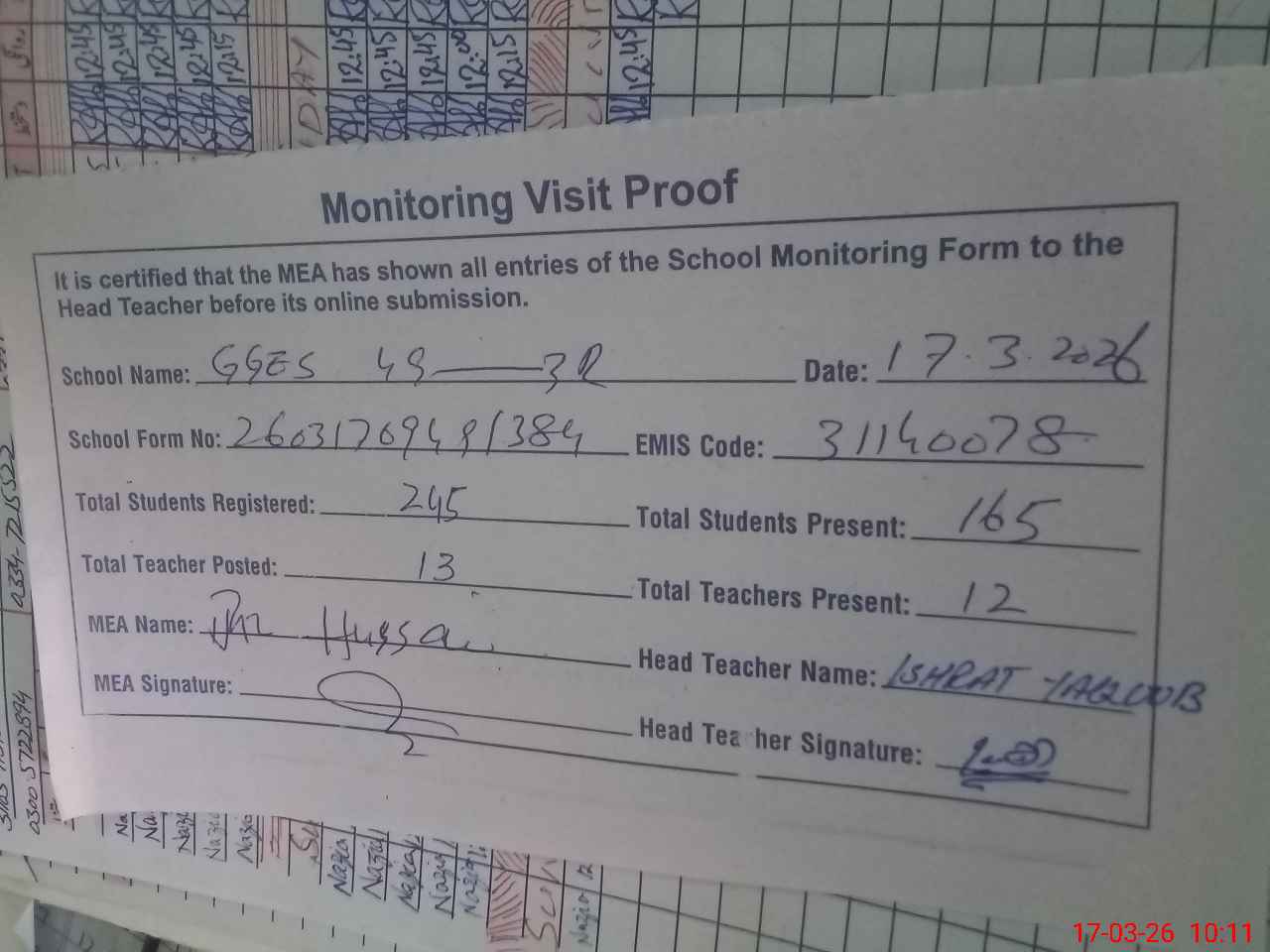 | Attendance Register | Head Teacher | MEA with School | Visit Proof |