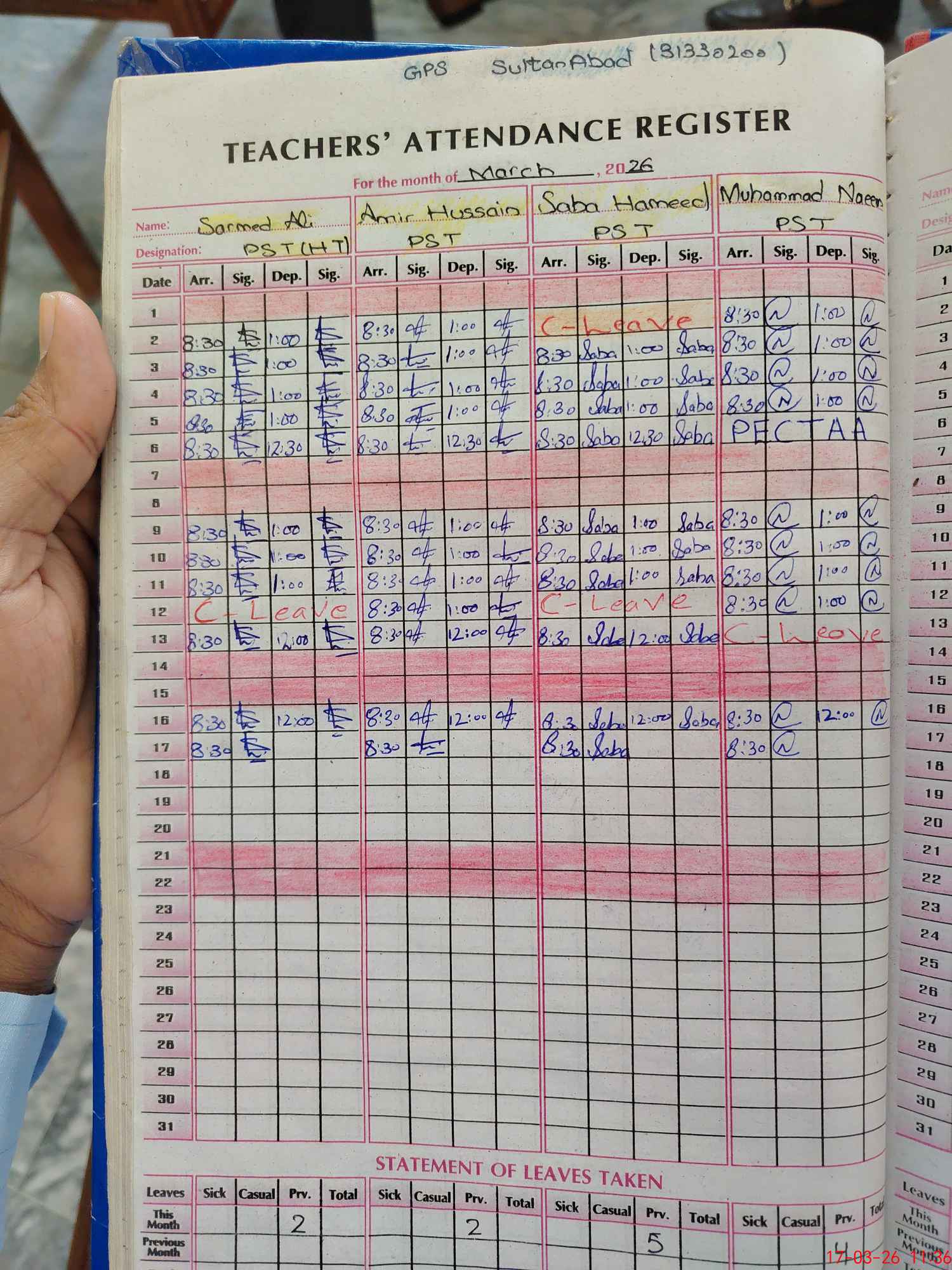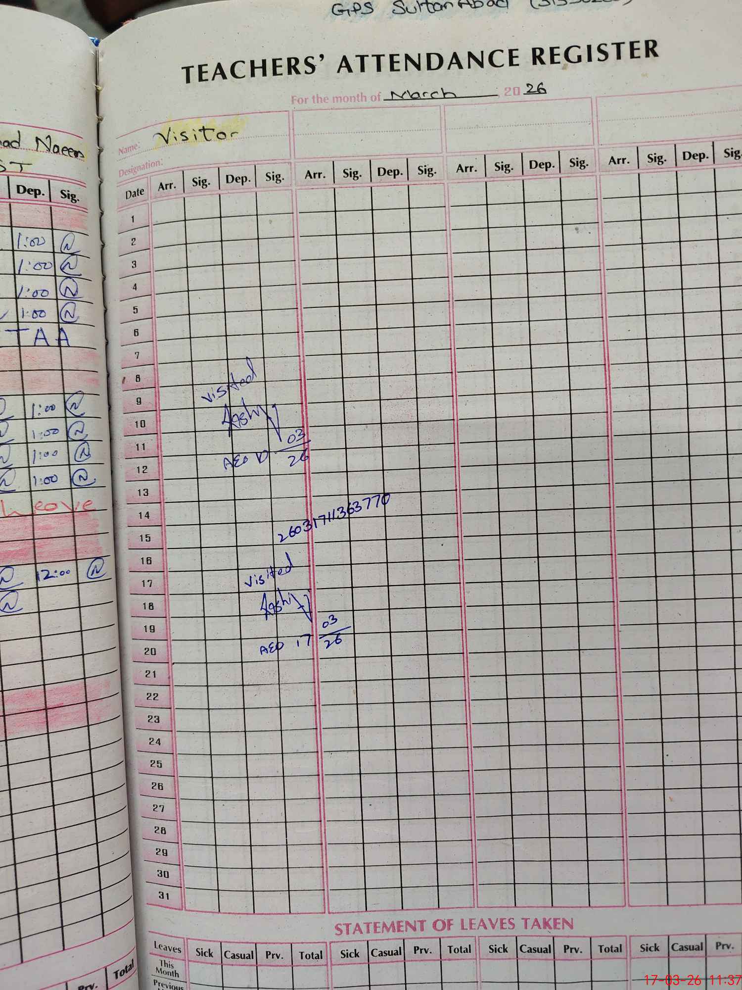 | Name: Se**** Al**** Designation: (School Headmaster's/Headmistress's) PST/PTC/JV Phone/Cell Number: 03**** |