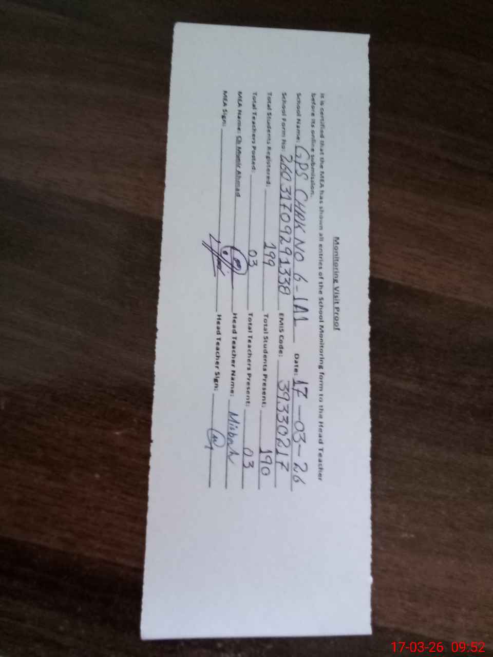 | Attendance Register | Head Teacher | MEA with School | Visit Proof |