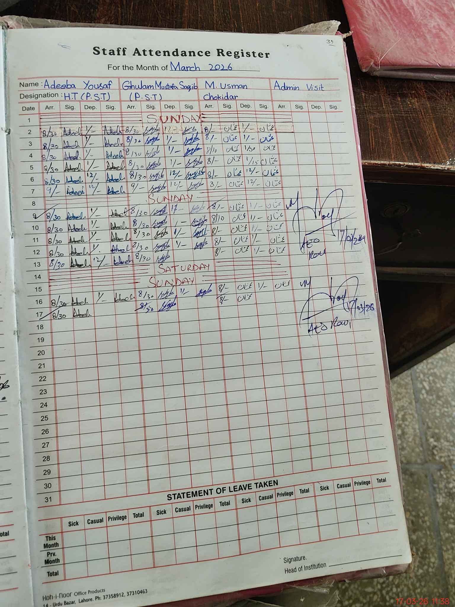 | Leave | Duty | Absent | Maternity | Medical | Ex- Pak |
