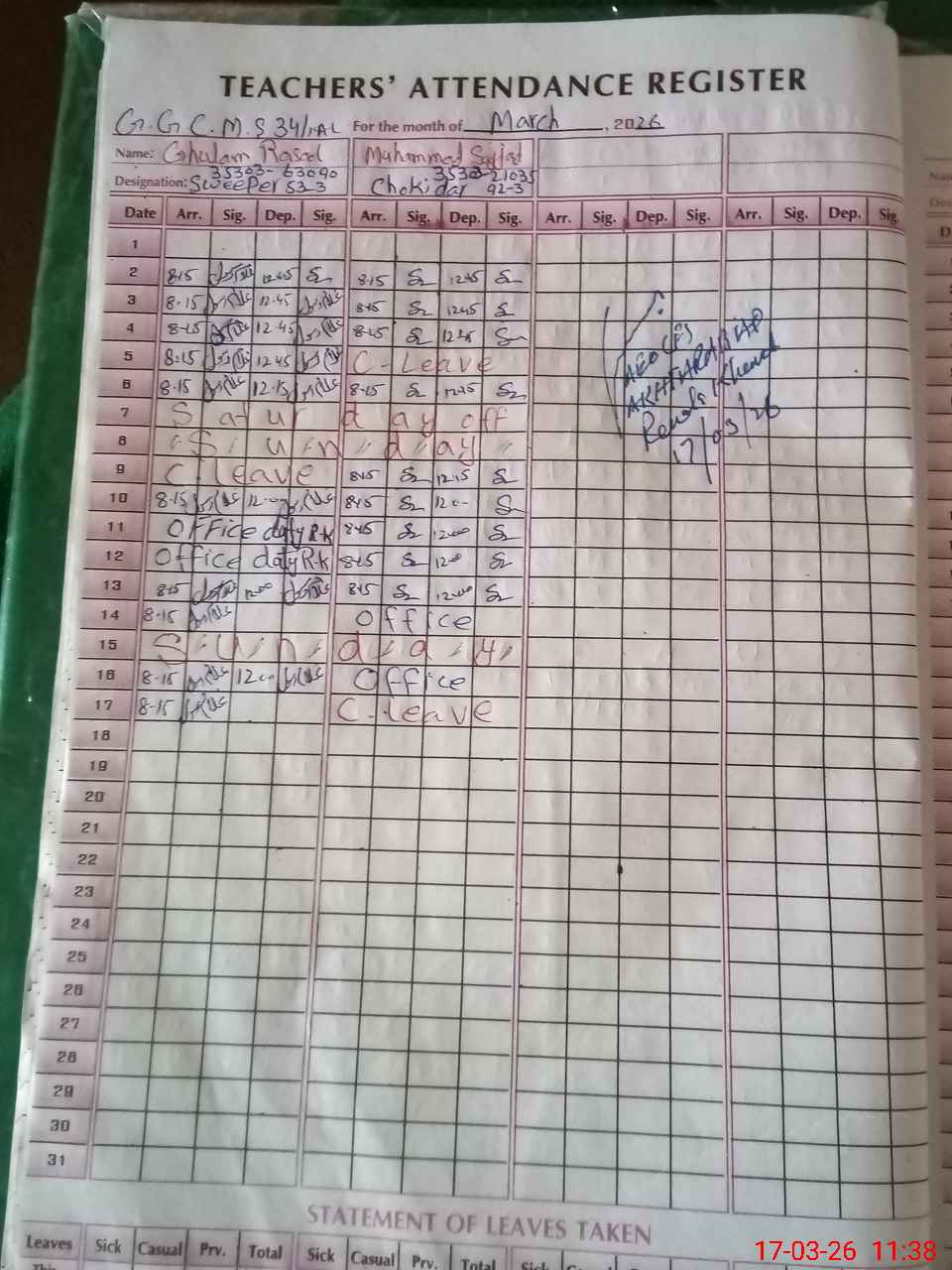 | 35**** | Mu**** Sa**** | CHOWKIDAR | 1 | 20 | 0 | 0 | 0 | 0 | 0 | 0 | 1 | Casual | |