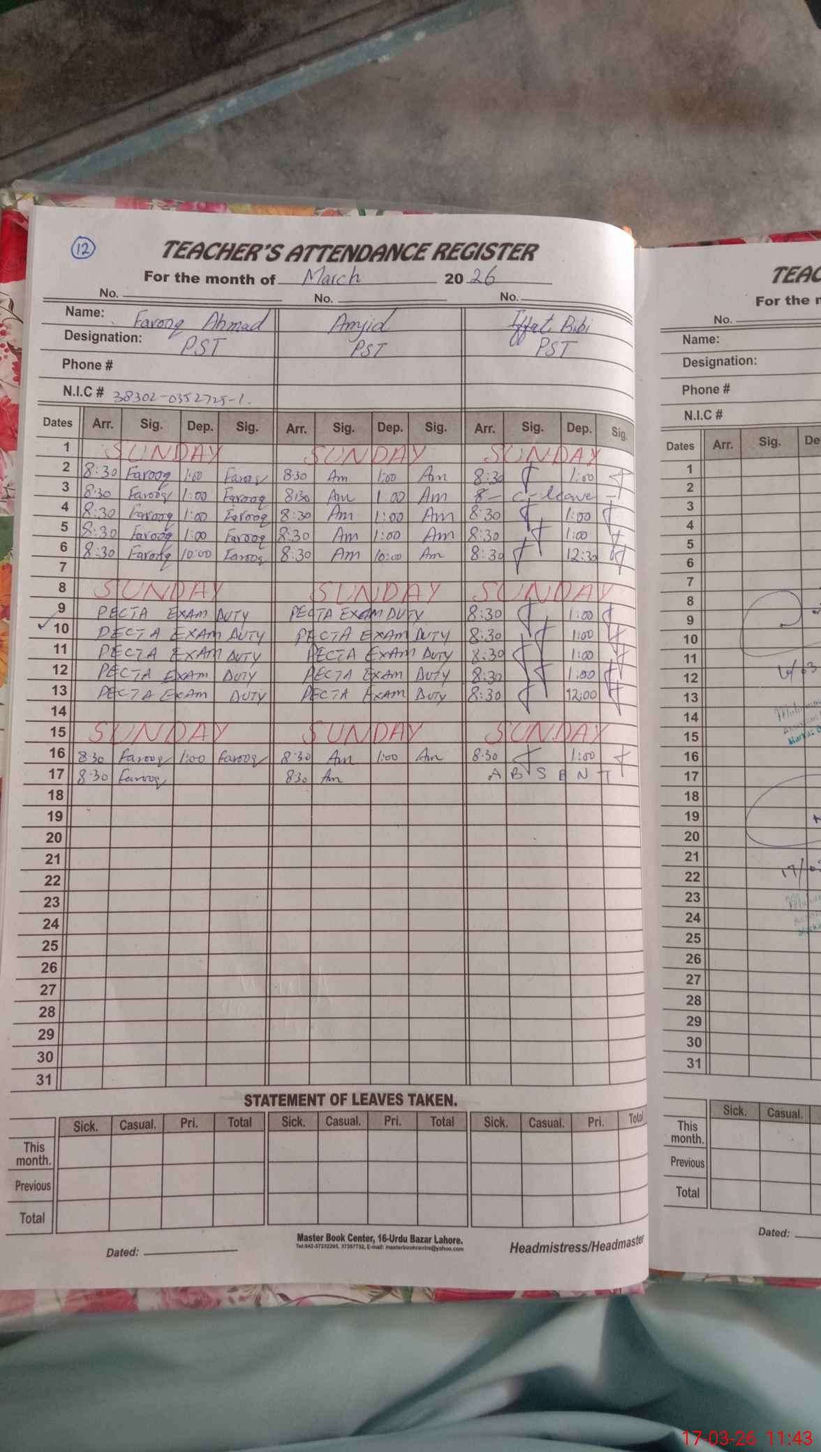 | CNIC | Full Name | Designation | R/C | Absence During Last Calender Month |