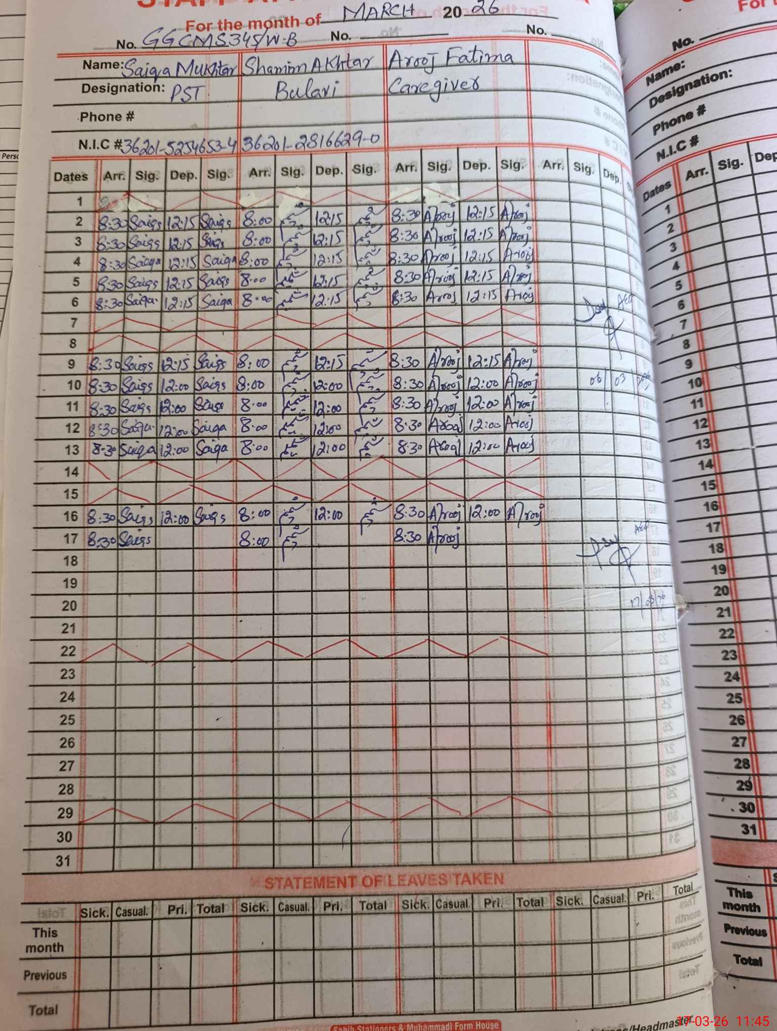 | CNIC | Full Name | Designation | R/C | Absence During Last Calender Month |