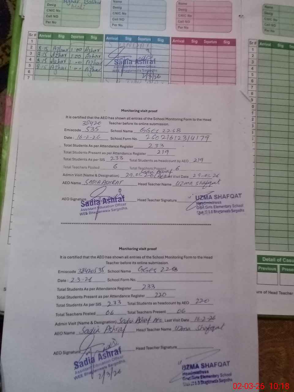 | Attendance Register | Head Teacher | MEA with School | Visit Proof |