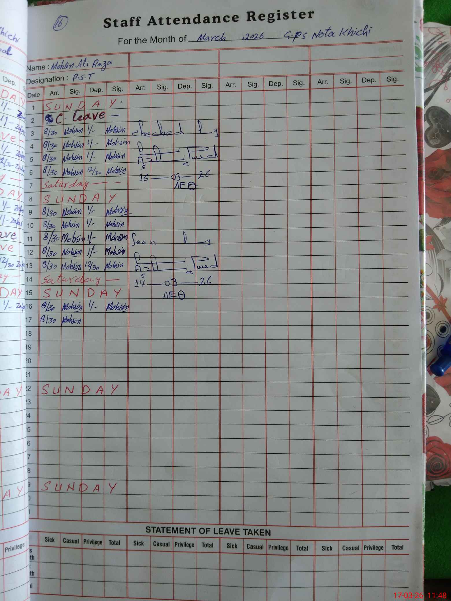 | CNIC | Full Name | Designation | R/C | Absence During Last Calender Month |