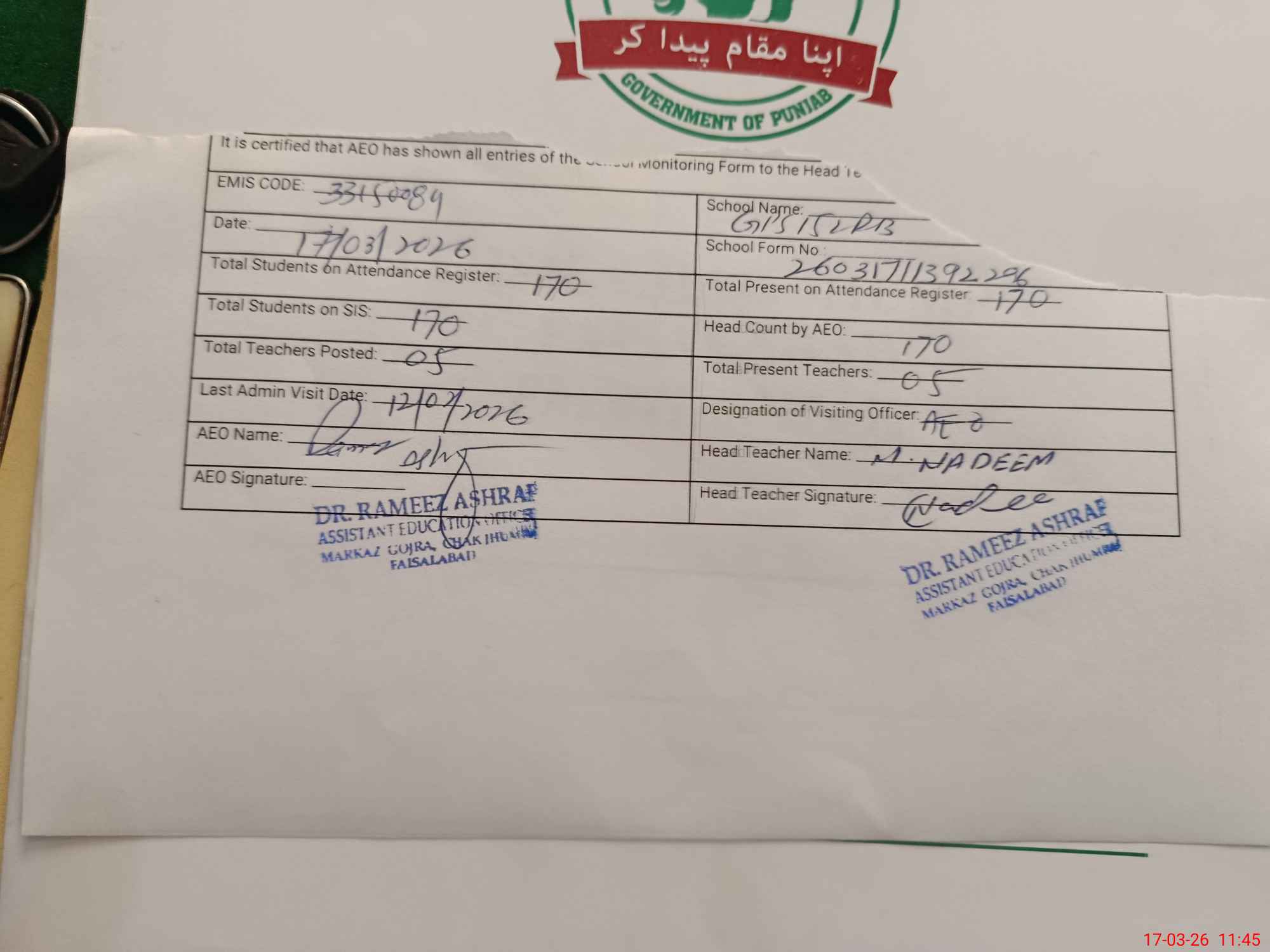 | Certified that this School was Inspected by the Undersigned MEA/DMO Today and the Information Stated Above is as Per Record. | |||||
