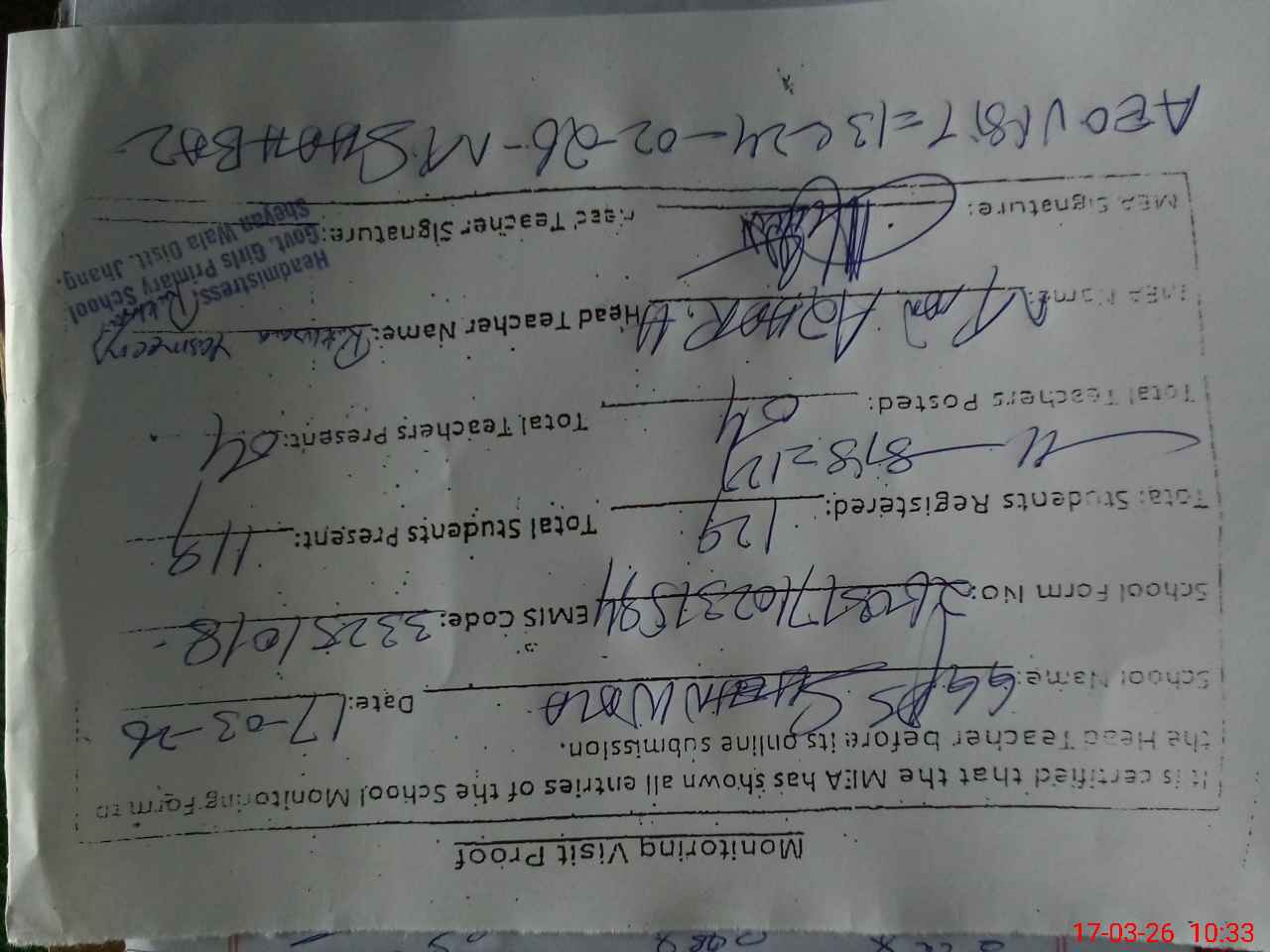 | Certified that this School was Inspected by the Undersigned MEA/DMO Today and the Information Stated Above is as Per Record. | |||||
