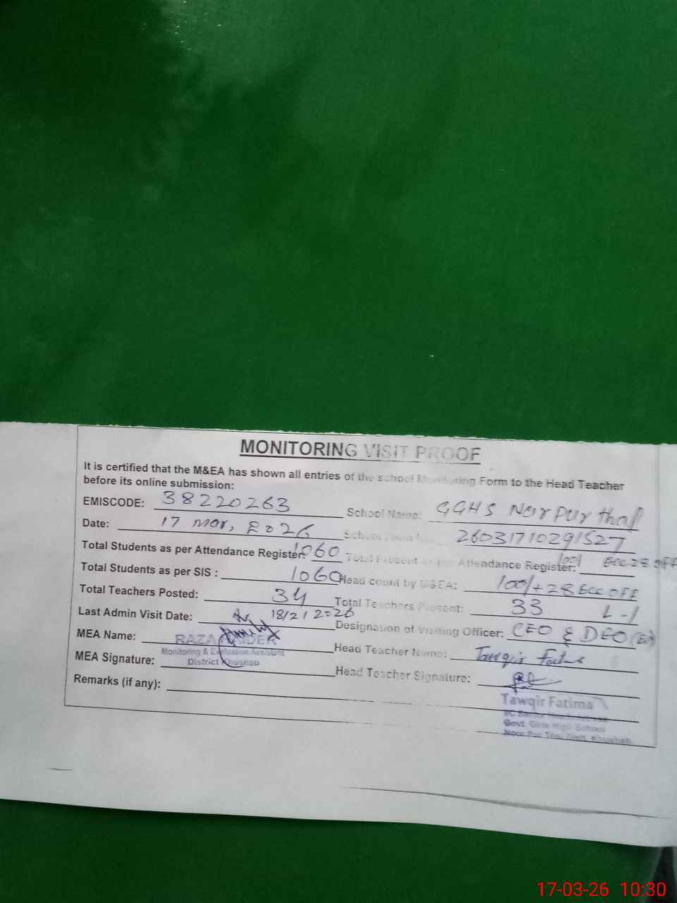 | Attendance Register | Head Teacher | MEA with School | Visit Proof |