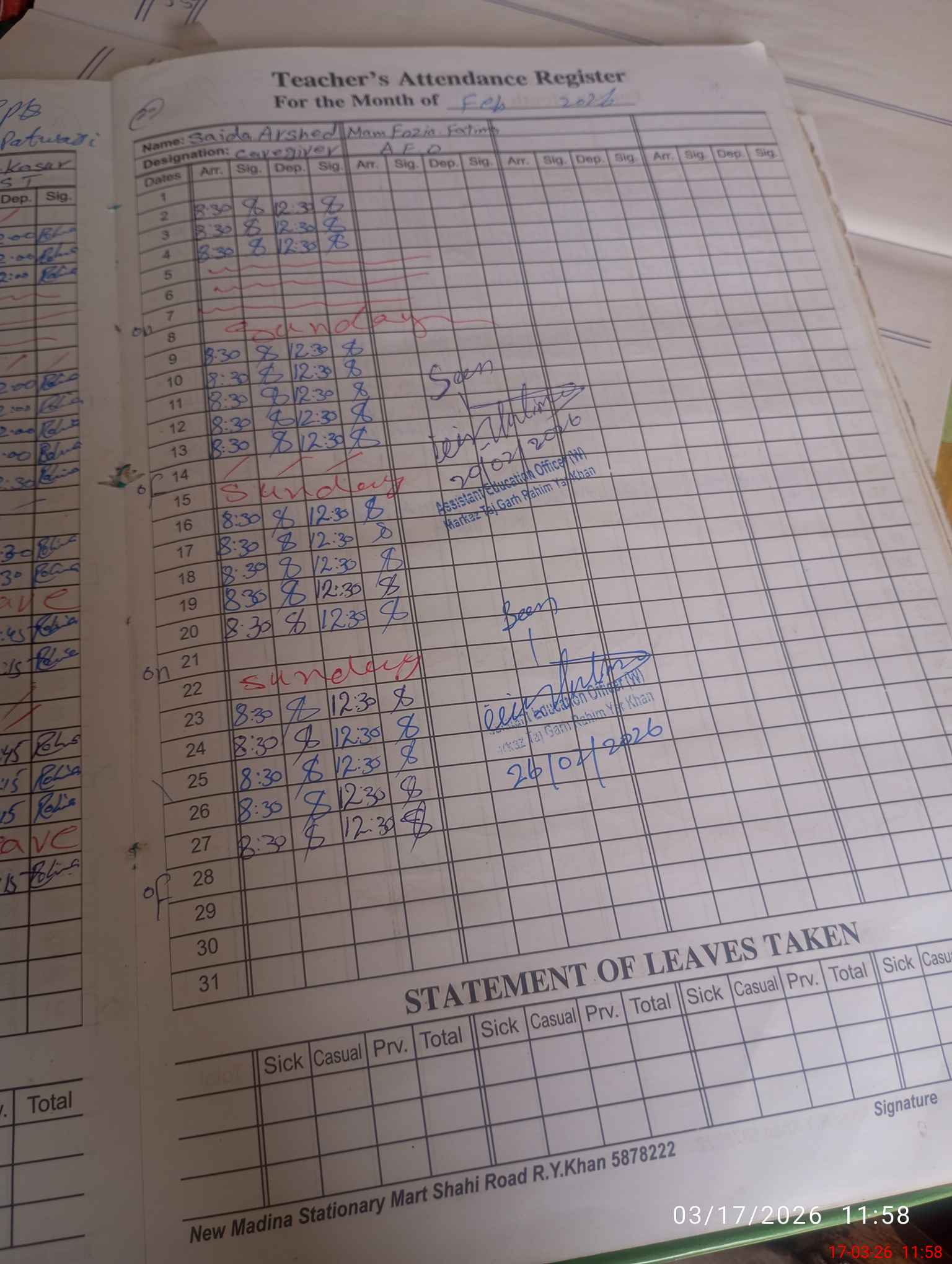 | CNIC | Full Name | Designation | R/C | Absence During Last Calender Month |