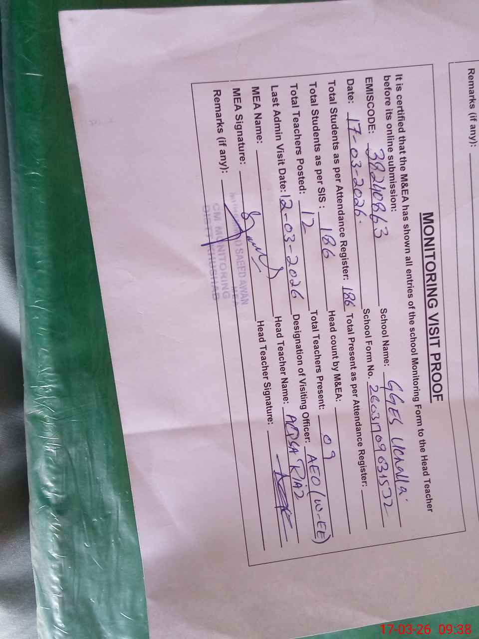 | Remarks (Use Separate Page if Required): Students on SIS QTY 186 Last admin visit On 12 March 2026 by AEO | |||||