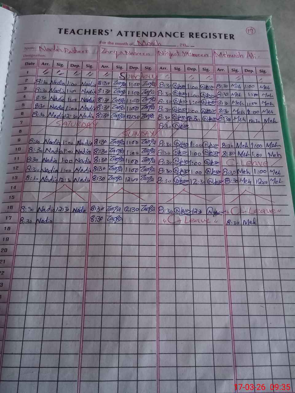 | CNIC | Full Name | Designation | R/C | Absence During Last Calender Month |
