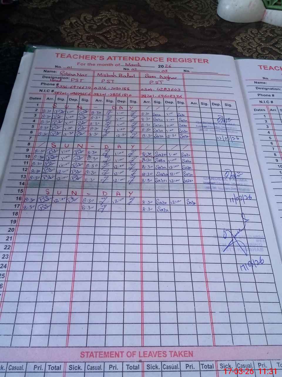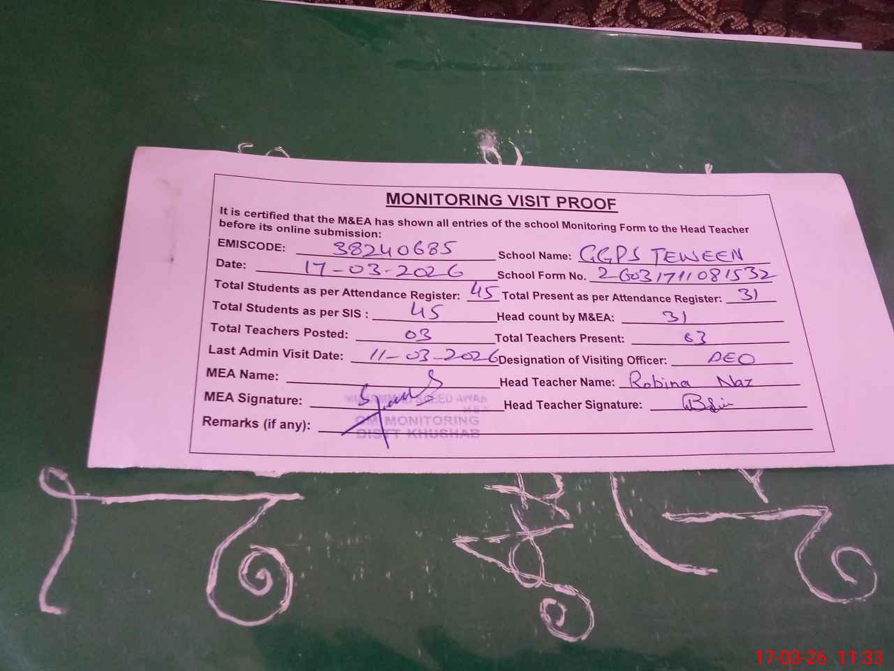| Remarks (Use Separate Page if Required): Students on SIS QTY 45 Last admin visit On 11 March 2026 by AEO | |||||
