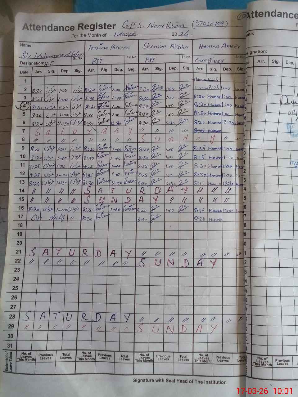 | Name: Mu**** Ir**** Designation: (School Headmaster's/Headmistress's) PST Phone/Cell Number: 03**** |