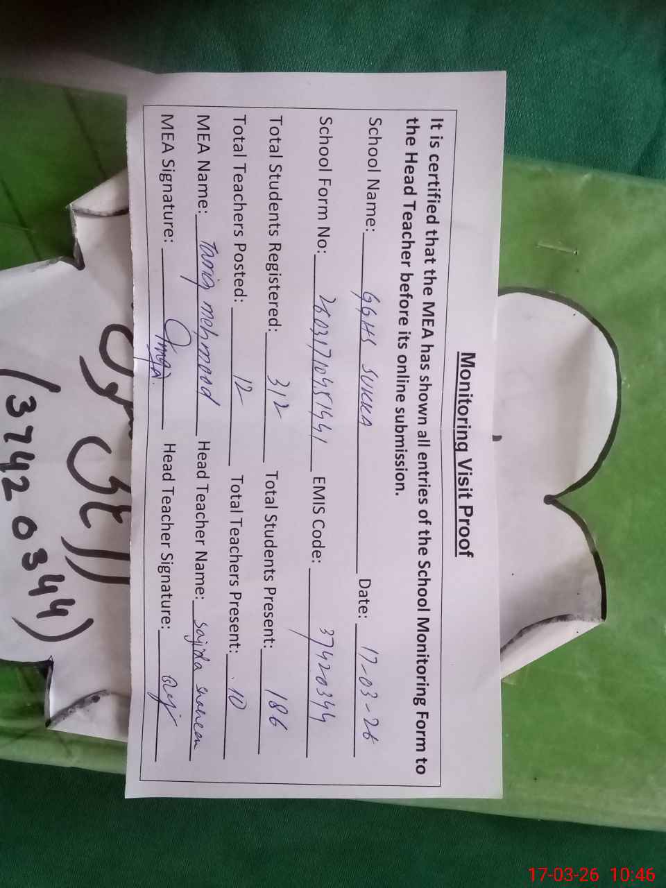 | Remarks (Use Separate Page if Required): ECCE and NURSERY CLASS ABSENT DUE TO NO PAPAER TODAY AND SPARED 53 STUDENTS OF CLASS 1&2 ARE WITHOUT FURNITURE AND SITTING ON GROUND | |||||