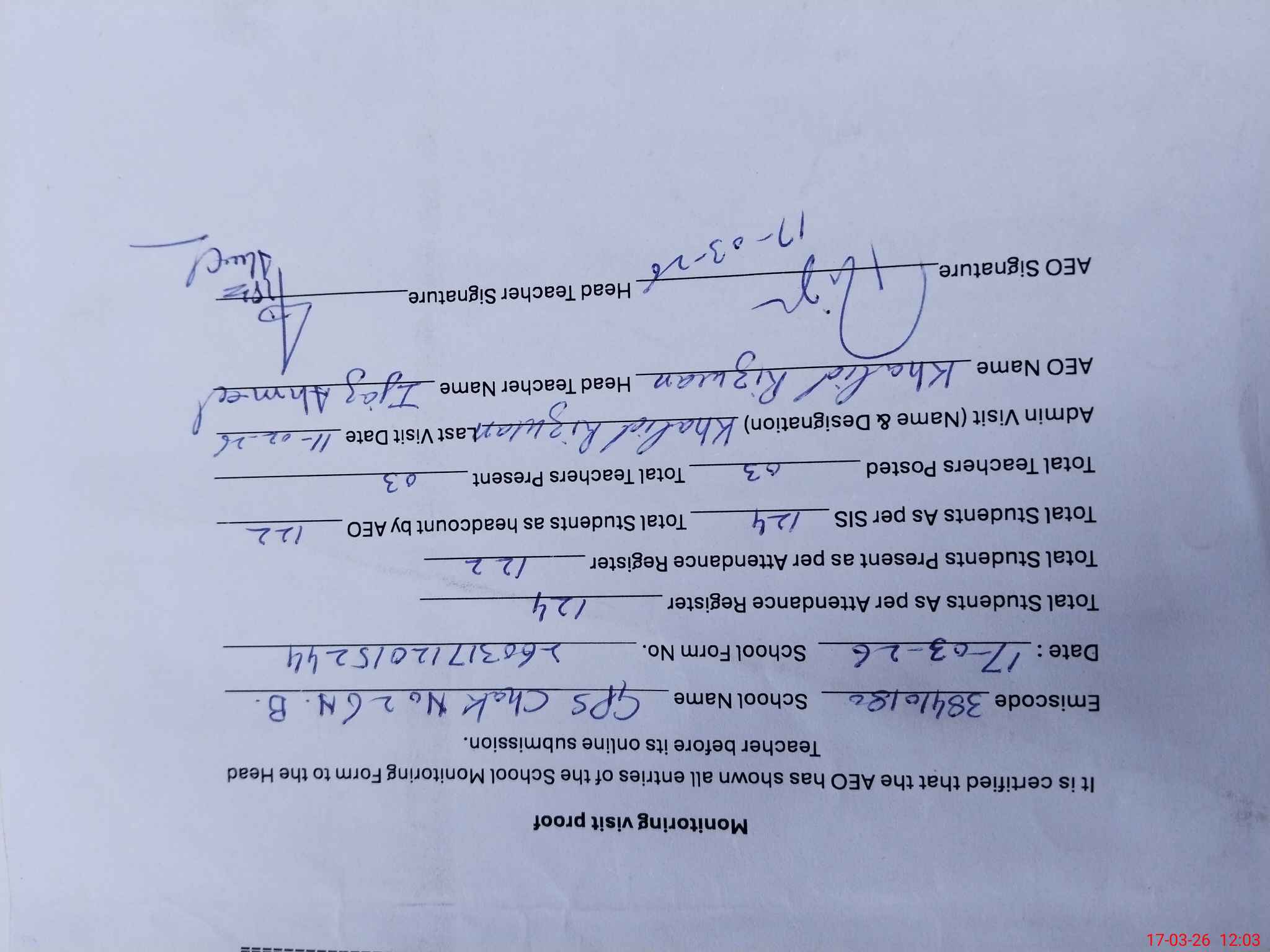 | Attendance Register | Head Teacher | MEA with School | Visit Proof |