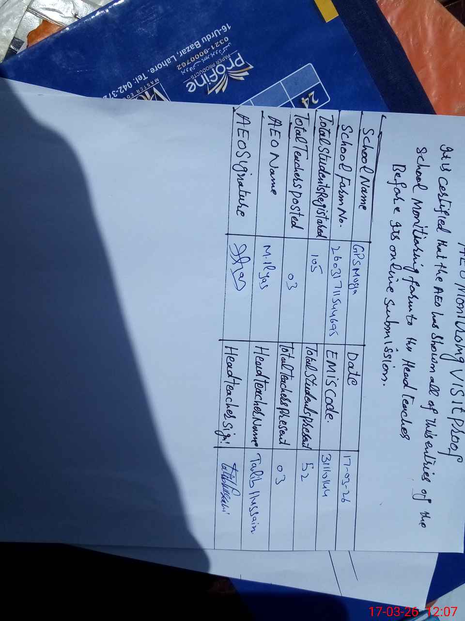 | Certified that this School was Inspected by the Undersigned MEA/DMO Today and the Information Stated Above is as Per Record. | |||||