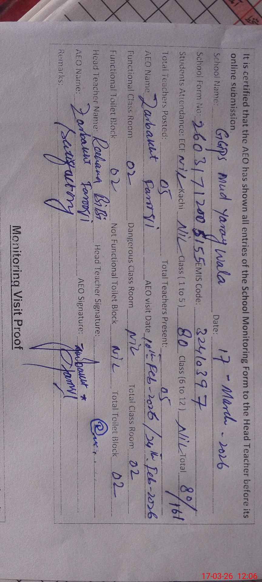 | EMIS Code: 32410397 | Name of School: GGPS MUD YARAY WALA | |||