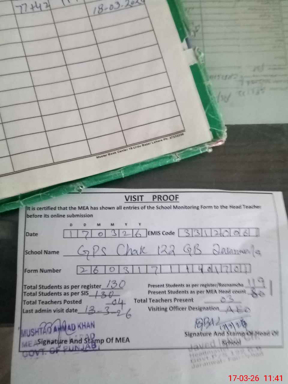 | EMIS Code: 33120061 | Name of School: GPS CHAK 122 GB JARANWLA | |||