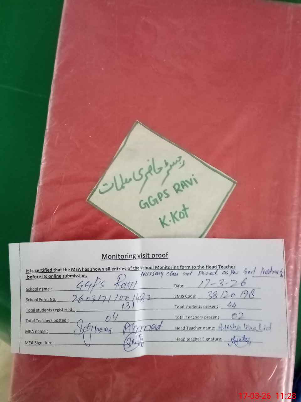 | Attendance Register | Head Teacher | MEA with School | Visit Proof |