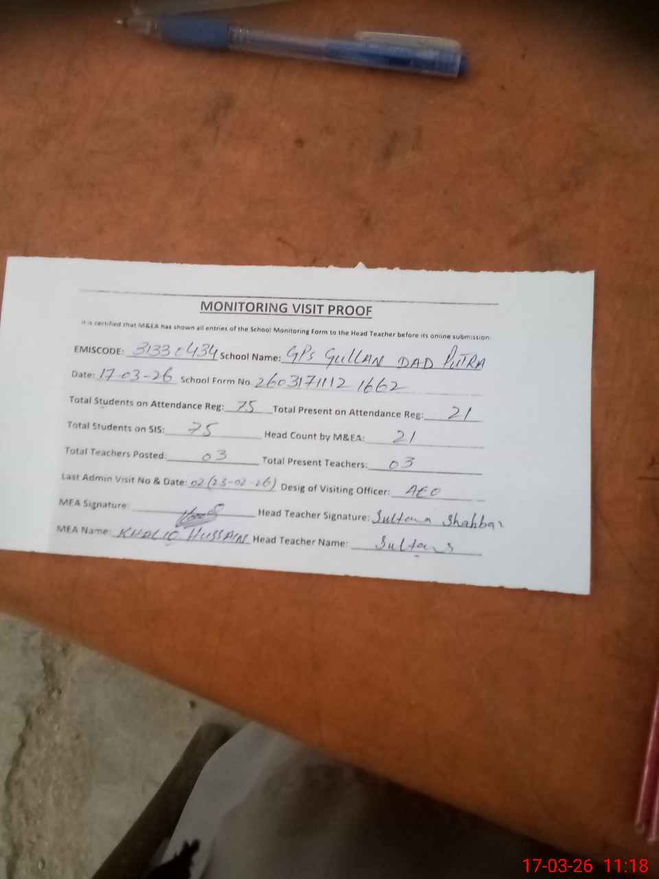 | Attendance Register | Head Teacher | MEA with School | Visit Proof |