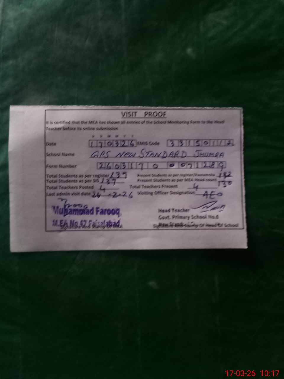 | EMIS Code: 33150112 | Name of School: GPS NEW STANDARD CHAK JHUMRA | |||