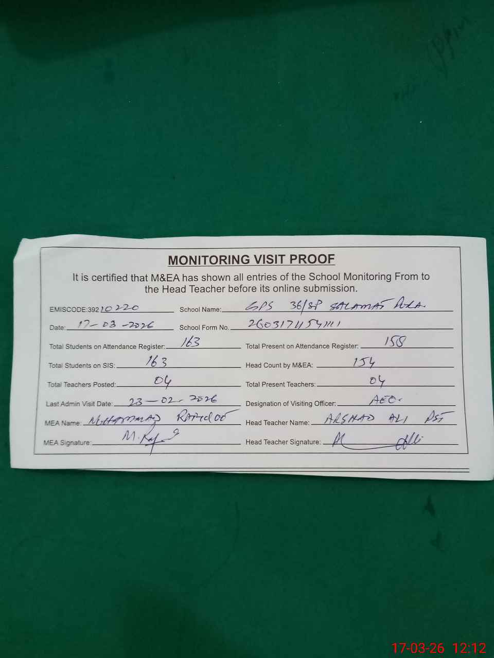 | Attendance Register | Head Teacher | MEA with School | Visit Proof |
