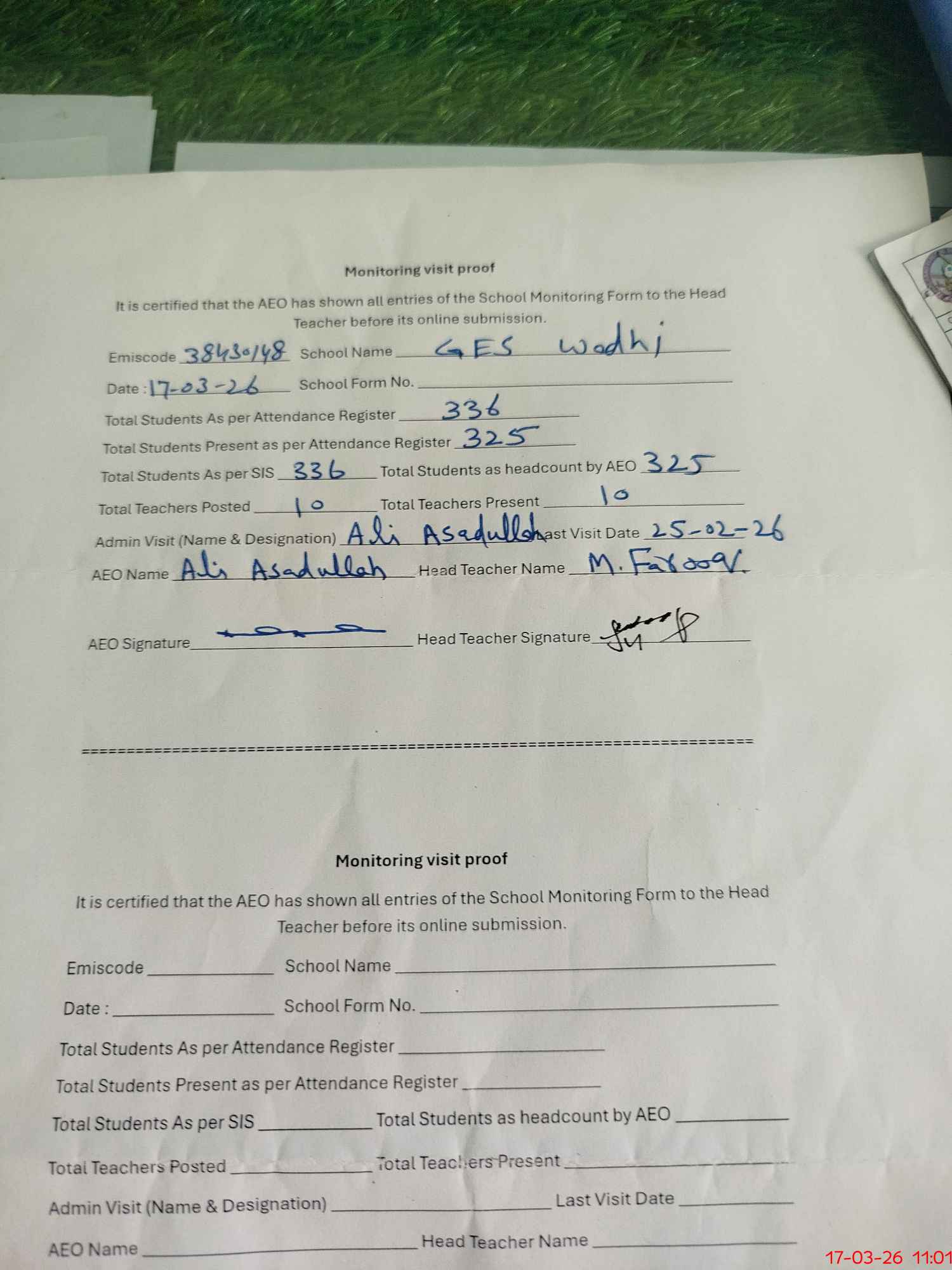 | Attendance Register | Head Teacher | MEA with School | Visit Proof |