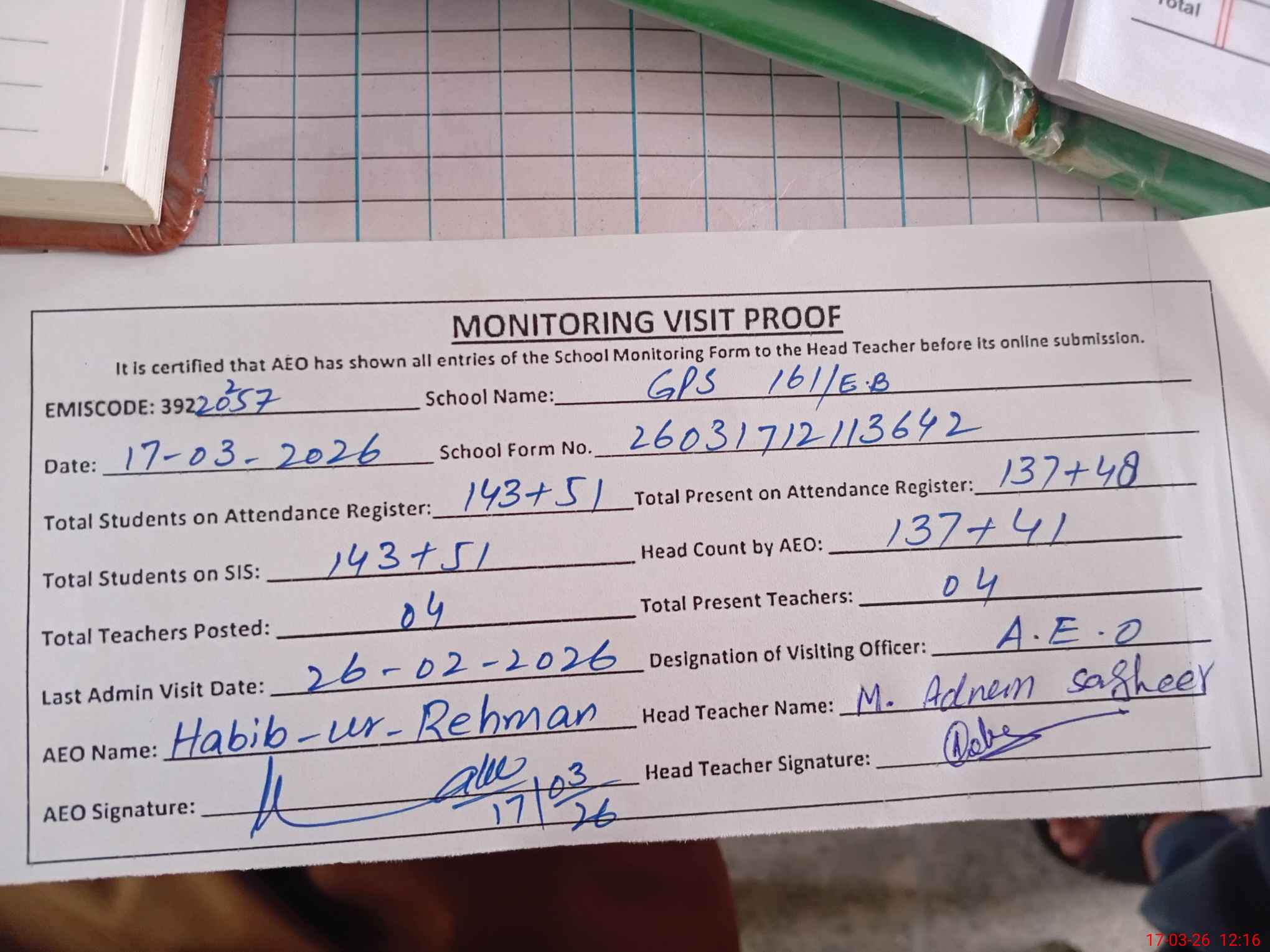 | Attendance Register | Head Teacher | MEA with School | Visit Proof |